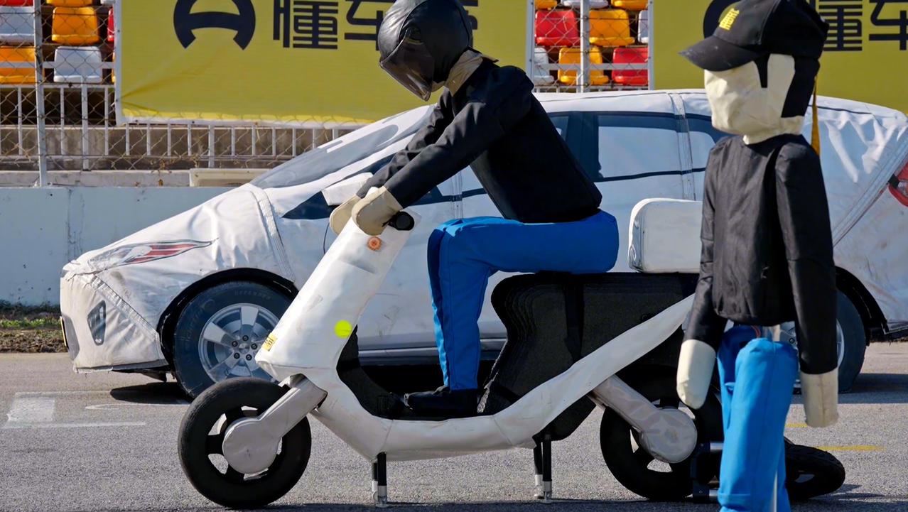 假人和常规四轮假车都是AEB测试中非常标准的识别物,而假人骑着两轮车的识别难度相对更大,因此,相比前两个项目,第三个项目更具看点;