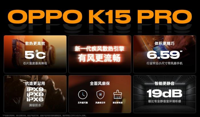散热方面,K15 Pro系列搭载新一代疾风散热引擎,全新升级低阻风道并创新散热架构,行业首发新一代疏密错位散热鳍片,配合超大面积“手撕钢”VC和超高导热率石墨凝胶,芯片温度最高降低5℃;行业罕见的小尺寸带风扇手机,风扇进风口微凸不到1毫米,视觉不突兀。