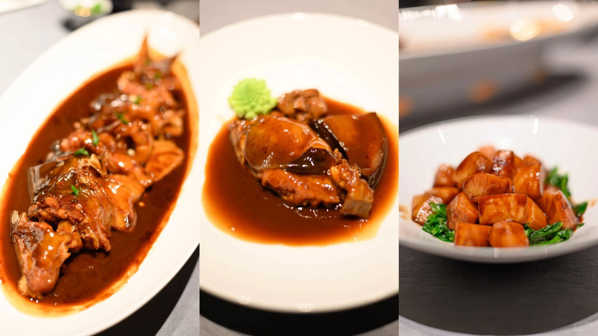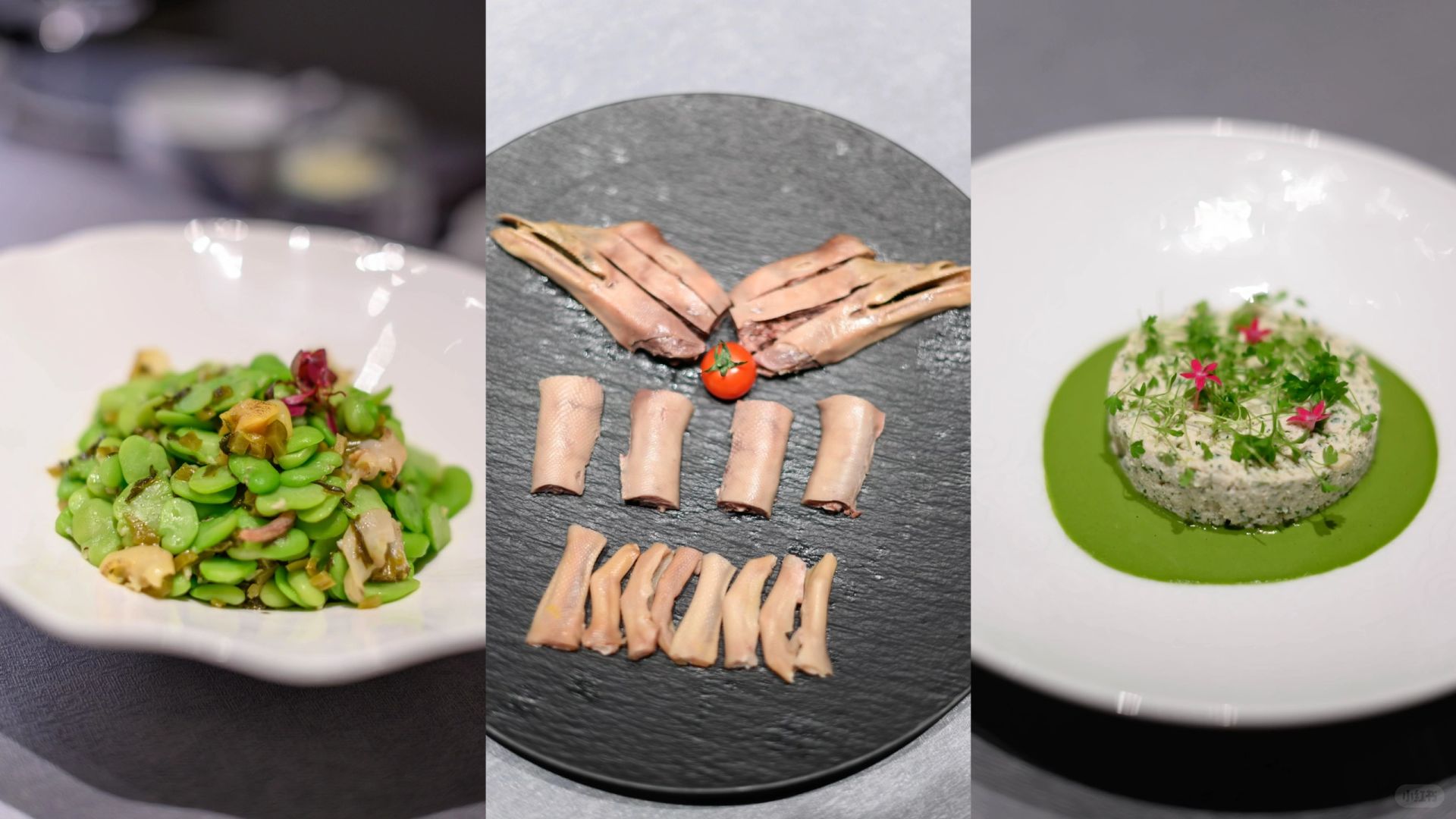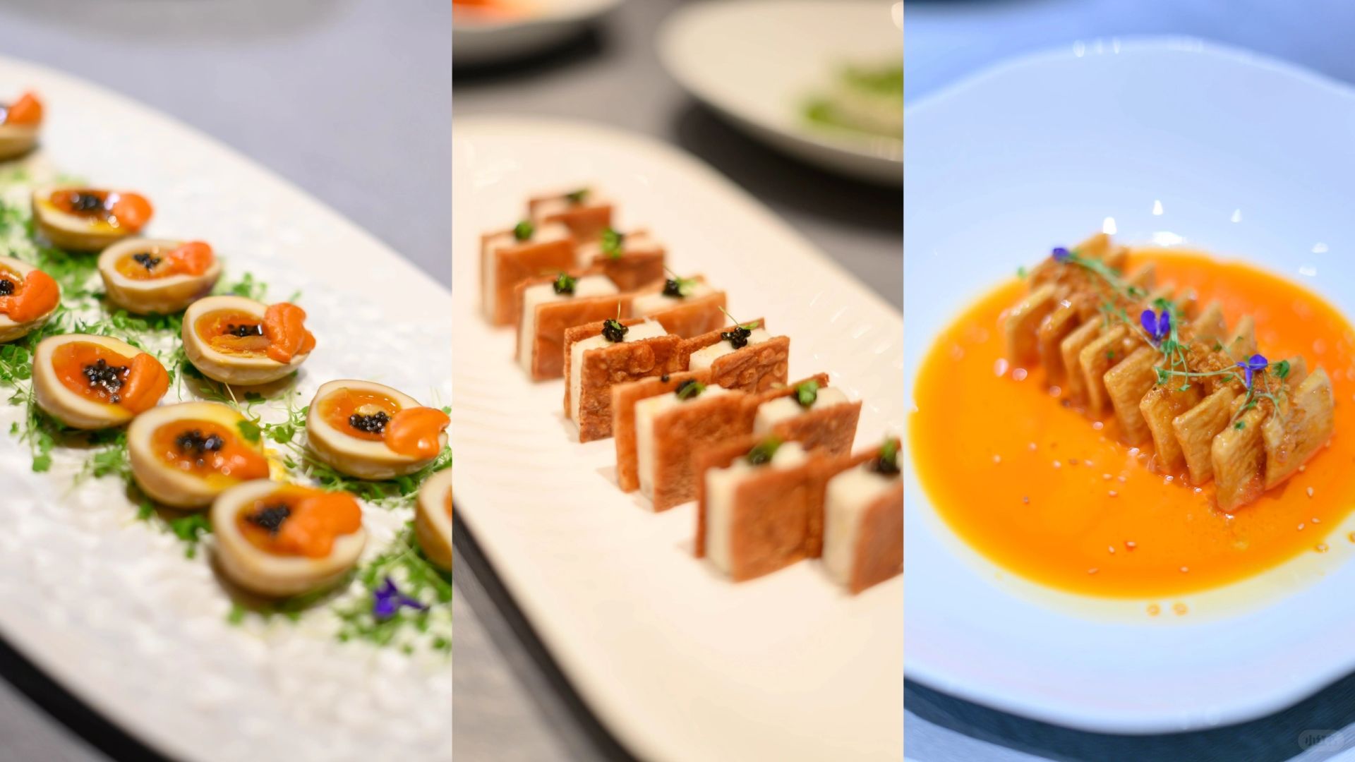 手打鲜刀鱼糕,鲜嫩美味,老陈皮牛肉酱汁的口感丰富,是上海人喜欢的略甜的口味。七彩花生白虾很惊艳,花生很香白虾干脆香也好吃。还有海胆醉流心蛋、香椿手工豆腐等冷菜都有春天的味道。
