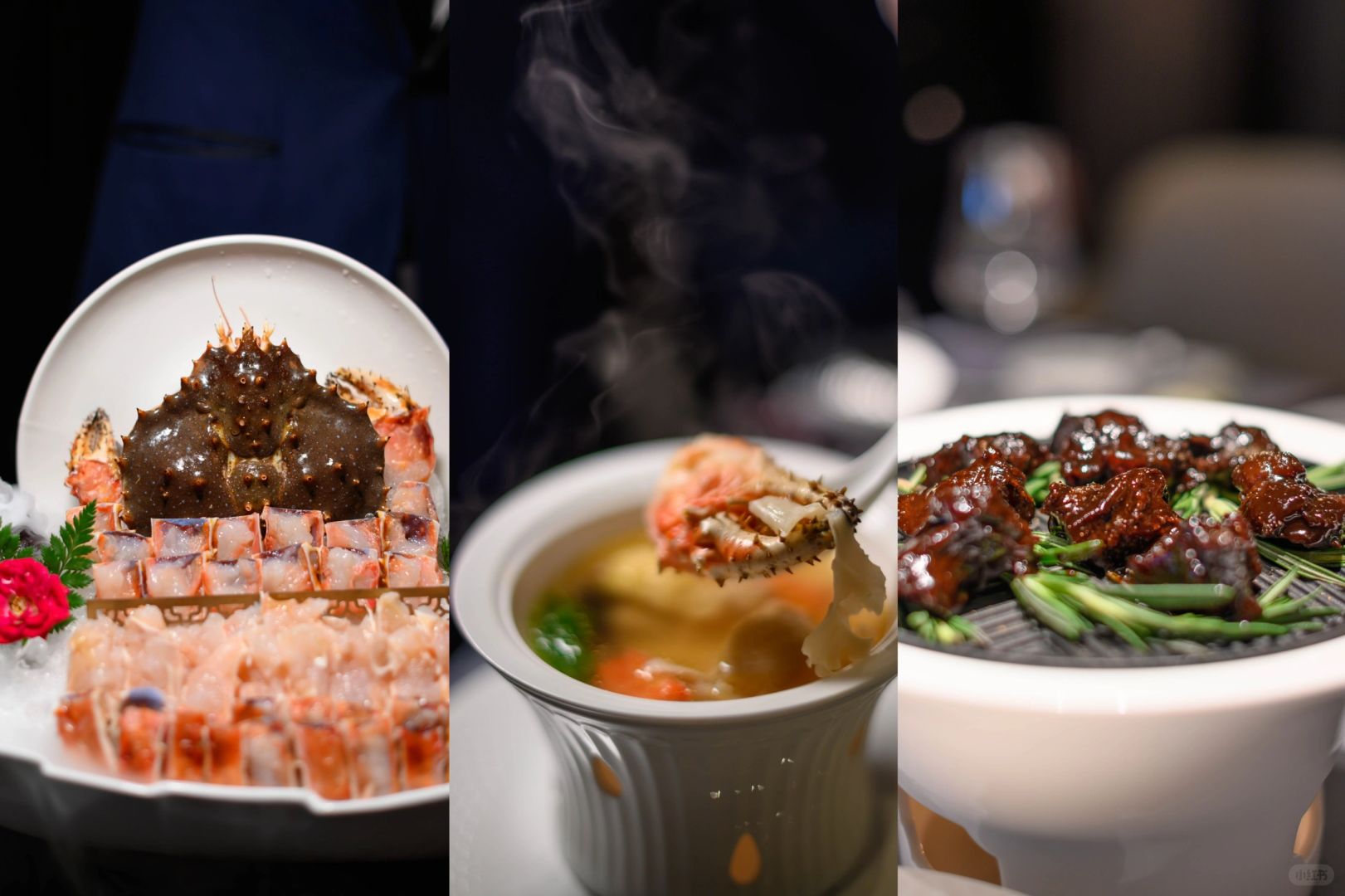 瀛洲澳龙特色三拼很有仪式感,做法也特别。生吃的龙虾肉用酱汁拌一拌,那原汁原味的鲜停留在舌尖。山海之间·帝王蟹真的特别好吃,新鲜有弹性的蟹肉,口感带着自然鲜甜,谁会不喜欢呢?内有乾坤火凤凰C版,属于特别制法的烤鸡,拆骨版吃起来更方便,鸡皮也特别脆。