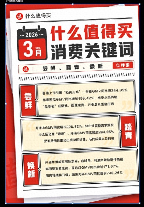 伴随气温回暖,春日活力正在多个消费场景中释放。舌尖上的“尝鲜”率先升温,3月平台水果品类迎来集中增长,西瓜、蓝莓GMV同比增长199.42%、19.18%;“踏青”热情则带动了专业户外装备的阶梯式进阶,冲锋衣、户外背包GMV分别同比增长226.32%和223.34%,出境游相关GMV同比增长67%;居家焕新则不仅体现在整体空间的调整,也延伸至更具生活情调的小型空间布置,不少消费者通过打造咖啡角、调酒台等兴趣区域,在方寸之间构建独属于个人的春日幸福感,相关家具与氛围型单品消费同步增长。
