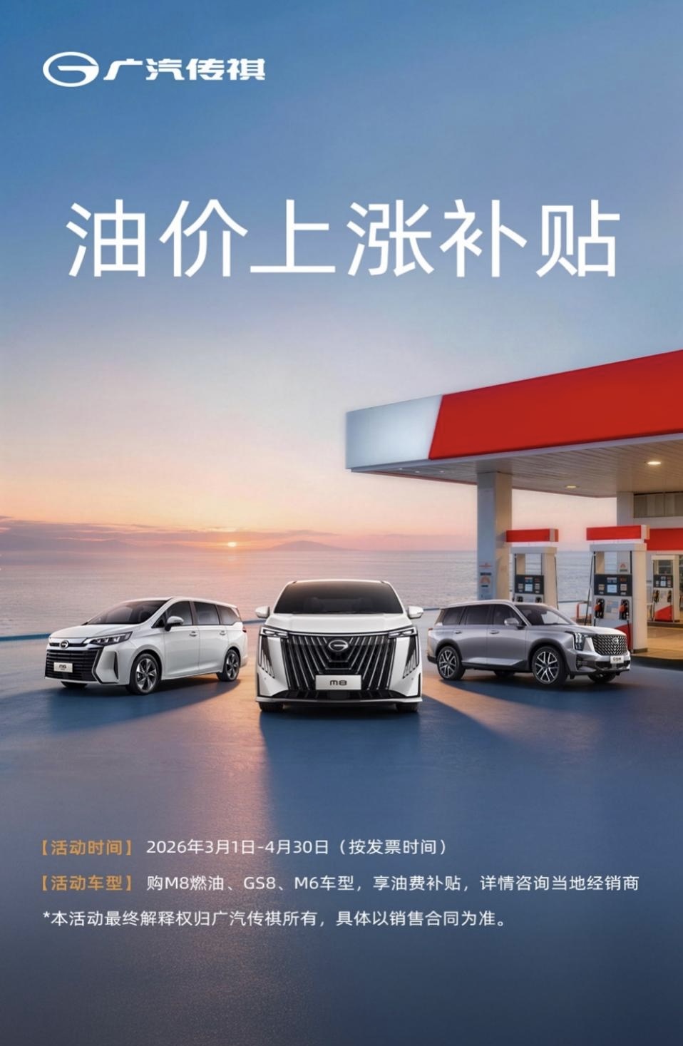 此外,传祺始终深度洞察用户痛点、始终立足用户真实所需。针对近期油价走高的市场行情,面向燃油车主暖心推出专项油价上涨补贴福利:对2026年3-4月购买传祺M8燃油、GS8、M6车型的客户,传祺将补贴因本轮油价上涨额外增加的用油成本,切实减轻用车成本,以真心举措传递温情关怀。