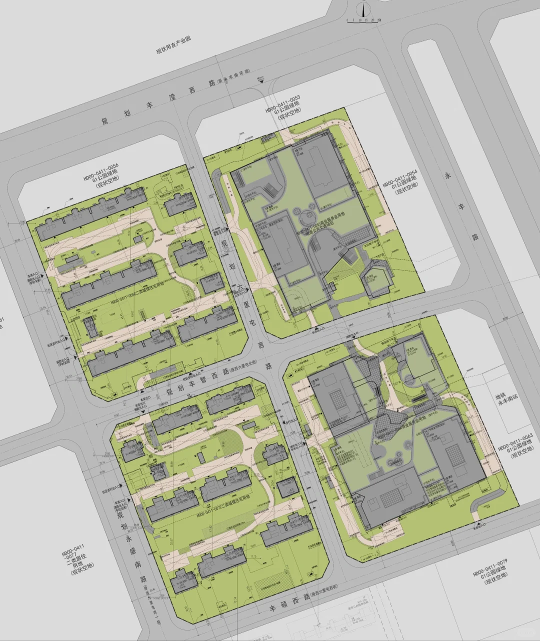 58号地和72号地是住宅用地,在西北、西南方位;55号地是商服公交用地——1栋酒店11层、1栋办公10层、1栋商业2层,在东北角;64号地是商服用地——有三栋11-12层酒店、1栋商业3层,在东南角,地铁16号线永丰南站旁边。