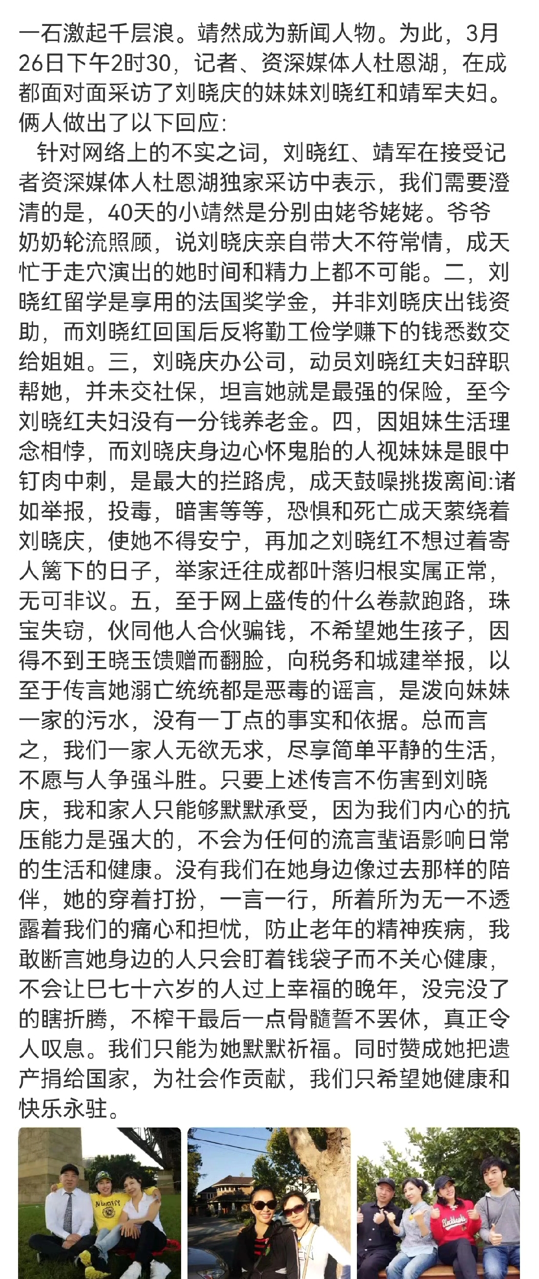 而造谣事件一天之后,有媒体称去成都面对面采访了刘晓庆的妹妹和靖军夫妇,他们做出的回应有五点,似乎全在否认刘晓庆说的事情,而且他们还说“赞成她把遗产捐给国家,为社会做贡献”。