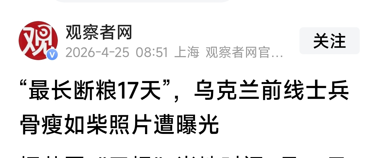 信源:观察者网《最长断粮17天”,乌克兰前线士兵骨瘦如柴照片遭曝光》