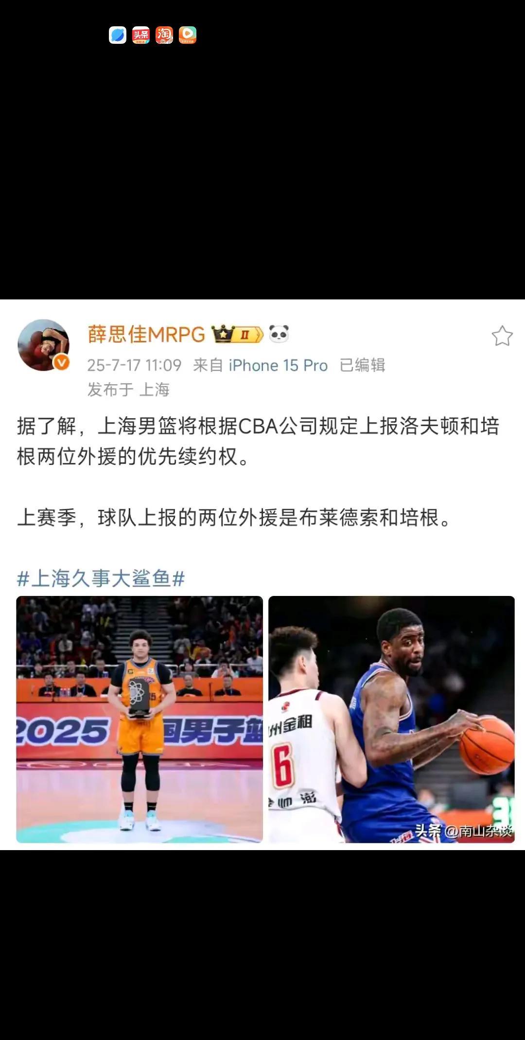 上海媒体报道,上海队将外援的优先续约权给了洛夫顿和培根。 这个就有意思了啊,据报