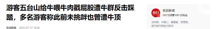 “这种人就是欠收拾!”五台山,一游客徒步故意挑衅牛群,用棍子故意捅牛屁股,又拿着牛肉干喂给牛吃!不料牛群实在受不了,竟然生气的开始“组团报复”,直接围攻男子,吓得男子躺地上直叫,但很快就叫不出声了!网友:纯活该! 7月17日报道,五台山几名游客徒步时特别没有素质,用登山杆挑逗牛,给牛喂牛肉干,还敲打扭屁股,以为这样很好玩、有乐趣,结果没想到下一秒就后悔了! 当时游客在徒步朝台上,看见一群牛正在山间吃草,他们就慢慢靠近牛群。作为游客,见到牛群在吃草可以选择拍视频记录,也可以和牛一起拍照打卡,但是决定不能伤害它们。好比如家里养的狗,逼急了还会咬人,牛肯定也是脾气的。 根据景区工作人员透露,这些牛正常情况下不会攻击人,他们也从来没有听过牛伤害哪位游客了。可是在7月份,牛竟然罕见的发脾气了! 其实这不怪牛,只能怪这群被欺负的游客!当这几名游客看到牛后,拿起手中的登山杆,敲打牛屁股,甚至还坐到牛身上。 他们想着这样很好玩,很有意思,自认为牛不敢拿他们怎么样,毕竟他们手中有登山杆能作为“保护”,所以始终认为自己很安全。 除了坐身上,打屁股之外,还有游客从口袋中掏出提前准备好的食物——牛肉,站在牛的身边,往它的嘴里喂。 那时候,牛闻到这种牛肉的味道后,一直摇头,怎么都不愿意吃,而游客们不但没有放弃,反而一直拿着牛肉干往牛嘴里喂,硬让吃。 他们没想到的是,这番行为竟把牛惹急了,一群牛发出阵阵声音,冲他们过来。当时的他们根本没有意识到危险,还认为牛只会从旁边过去,不会伤害他们,却没想到牛直接将其中一个人团团围住。 这个游客显然是吓怕了,没想到牛竟然将他包围住,无论哪个方向都有牛,导致他根本无法逃脱,于是游客就躺在地上打滚,然而,当他躺地上后,牛抬起脚就是一顿踩。 游客不断发出痛苦的叫声,可没有人能救得了他。这时候谁敢上前?如果上前帮男子解围,不但赶走不了牛,反而还会把自己也牵连进去,下场和游客一样。 一时间,同行的人都在一旁默默看着,不知道该怎么办。而路过的游客看到这一幕后,忍不住说了句“活该!” 牛不招惹他们,他们去招惹牛,那不是自找的吗?对牛做出这么过分的事情,别说牛反抗了,谁看见了都忍不了。 作为一名成年人,该有的素质都没有,保护动物保护到哪了?这不是口头上喊喊那么容易,是要做到日常生活中的,实际行动中的。 当网友们看到这行人的下场后,没有人同情他们,全都在怒斥他们,真的是太丢人了,太缺德了,自作孽不可活! 其实,从画面上看,牛还是克制的,如果真火就会用角去挑。这几个人多半会受不同程度的伤。不做不死,说的就是这样的人!