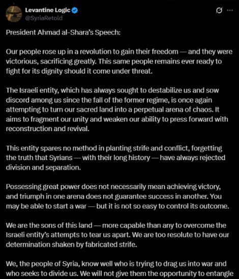 以色列介入苏伟达事件,并空袭了叙利亚总统府和多处军事设施之后,朱大帅终于发表全国电视讲话了。在讲话中,他指责以色列在叙利亚境内“挑起不和与分裂”,并誓言要保护德鲁兹人的权利。 这一下子,不仅国际社会疯狂指责朱拉尼政府有恐怖组织的作风,就连以色列也打着支援德鲁兹人的旗号直接对叙利亚南部和首都大马士革进行了空袭。 朱大帅对着全国电视镜头讲话时,眉头就没舒展过。他骂以色列“挑事”,说对方想把叙利亚撕成碎片,又拍着胸脯保证“德鲁兹人的权利,我护着”。 这话一半是说给德鲁兹人听的,怕他们真信了以色列的,继续跟政府对着干;另一半是说给以色列听的,暗示他们“别拿鸡毛当令箭”。 朱拉尼还说,叙利亚现在有两条路:要么政府为了德鲁兹人跟以色列开打,要么德鲁兹人先顾全大局,不要扩大双方矛盾。 这话听着霸气,但实则透露着无奈。叙利亚哪里真敢开打?阿萨德政府攒下的那点家底都在去年年底的叙利亚内战中被以军定点清除了。叙利亚的军队现在连国内冲突都摁不下去,手里的坦克好多是上世纪的老古董,以色列的F-35一飞过来,怕是连还手的机会都没有。 德鲁兹人在叙利亚南部势力不小,尤其在靠近以色列边境的地方,占着不少地盘。他们信的教跟主流穆斯林不一样,这些年靠着抱团,在当地说话硬气。朱拉尼政权支持的穆斯林群体跟他们闹冲突,本就是想压一压德鲁兹人的势头,没成想给了以色列插手的由头。 而且以色列哪是真关心德鲁兹人的死活?它在戈兰高地占着叙利亚的地盘,最怕南边的德鲁兹人跟叙利亚政府拧成一股绳,平时就没少派自家境内的德鲁兹人去收买当地的部族头目。 现在叙利亚自己内乱,以色列正好打着“支援”的旗号扔炸弹,既能削弱叙利亚政府的实力,又能让德鲁兹人觉得“以色列比叙利亚政府靠谱”,一箭双雕。 朱大帅的安全部队镇压时下手狠,这会儿却得反过来哄德鲁兹人。电视里他把“保护权利”挂在嘴边,暗地里怕是在给德鲁兹部族首领递话:先停火,好处少不了你们。毕竟,要是德鲁兹人真倒向以色列,叙利亚南部就得改姓“以”了。 阿萨德时代哪有这窝囊事?那时候国内族群矛盾没这么炸锅,军队手里的家伙也够用,以色列敢扔一颗炸弹,叙利亚的导弹能立马怼回去。可现在不一样了,新政府上台后,面对的是一个折腾了十多年内战的国家,政府国库比脸都干净,年轻人要么跑了,要么死了,剩下的军队连维持基本秩序都费劲。 朱大帅没喊着要跟以色列拼命,不是没血性,是真没资本。安全部队刚在镇压里耗了不少力气,弹药库的储备看着就心慌。 他们现在真跟以色列开干,总统府怕是撑不过三天,到时候别说搞定德鲁兹人,自己能不能保住位子都是个问题。 以色列也没打算把事做绝。炸弹扔了,狠话放了,目的就达到了。它要的不是占领叙利亚,毕竟以色列的人口就那么多,土地抢过来也没人过去定居,那不如就让这个国家一直乱下去——越乱,就越没人能跟它争戈兰高地,越没人能管它在边境的小动作。 朱大帅的电视讲话,更像在走平衡木。对着德鲁兹人,他得装成“自己人”;对着以色列,他得露半分硬气;对着国内其他群体,他又得强调“国家不能散”。每句话都在踩钢丝,生怕哪头没顾到,自己先掉下去。 这场冲突里,德鲁兹人成了块夹心饼干。政府镇压时挨了打,以色列空袭时又被当成“借口”,他们心里的火气不比谁小。朱大帅在讲话里反复提“保护你们的权利”,就是想把他们拉回自己这边——真让德鲁兹人跟以色列勾连起来,叙利亚南部就得成另一个“国中之国”。 说到底,朱大帅现在的日子,是内外夹击。国内的族群矛盾像堆干柴,一点就着;国外的以色列拿着火柴,随时想扔过来。他不敢硬,也不能软,只能在讲话里揉进各种小心思,既要稳住内部,又要挡开外部的拳头。 以色列的炸弹炸完,估计也会歇一阵。它要的是“搅乱”,不是“占领”,见好就收才是聪明选择。朱大帅的讲话,算是给了双方一个台阶:你炸了我,我骂了你,这事先翻篇,谁也别再往前拱。 只是国内的烂摊子还得收拾。穆斯林和德鲁兹人的仇怨没消,安全部队的镇压结了新恨,朱大帅的“保护权利”说出去,能不能真让德鲁兹人信服,还得看接下来的动作。毕竟,嘴上说的再好,不如让街头的枪声先停下来。 这场风波说到底,还是叙利亚自己弱了。要是国力够强,内部族群能和睦,外部势力哪敢随便扔炸弹? 个人观点,仅供参考