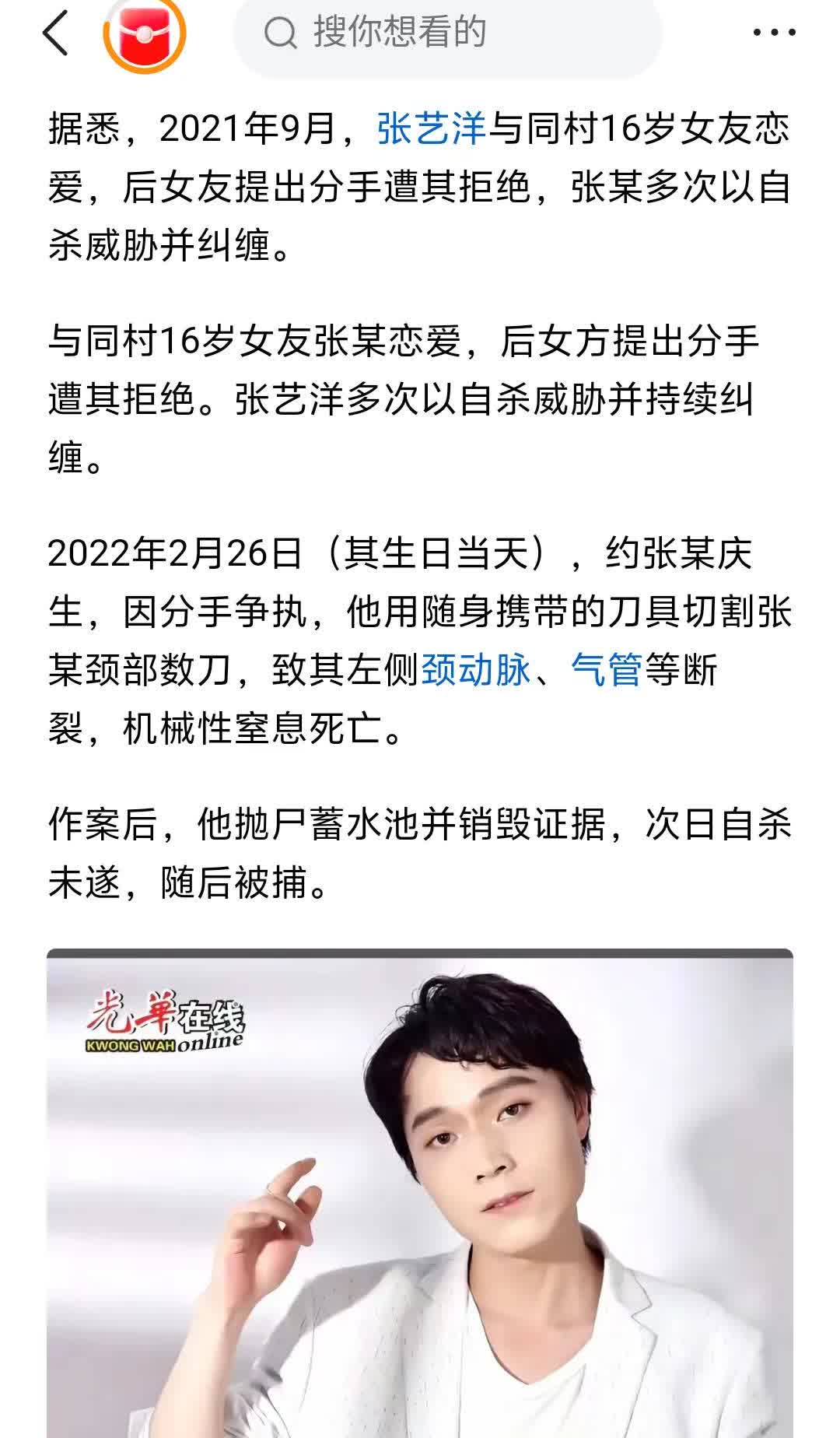 张艺洋给人的第一印象便是:阴郁,况且他无论面相还是气质都与洗剪吹别无二致,凭借运气进了娱乐圈,能数得出的作品名称串联起来恰似他命运的伏笔,着实可怖。从他目露凶光的眼神透出的杀气,可以笃定他能够干出这么令人发指的事情,他灵魂的黑化早已不是一朝一夕。 聊热点