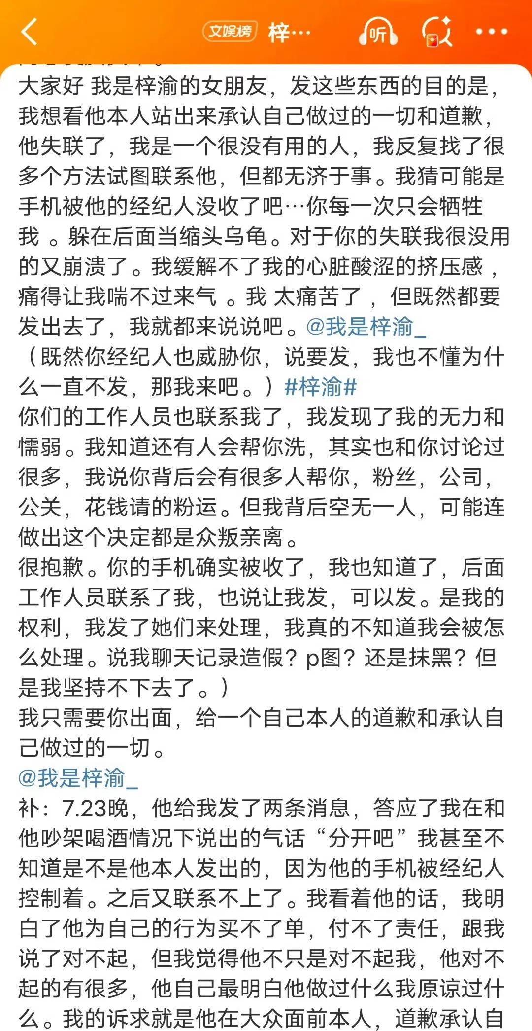 前IXFORM成员被曝录音威胁?自称女友长文控诉:精神控制逼我下跪! 昨晚博主@是梓渝的小朋友啊 发千字长文,自曝与男团IXFORM前成员梓渝恋爱内幕: 控制狂细节:查手机定位、删光异性好友,甚至逼她当街下跪道歉; 录音锤反击:晒出男方语音“你敢分手就毁了你”,疑因女方拒删合照遭威胁;精神崩溃:称抑郁暴瘦至70斤,男方冷嘲“装病博同情”,梓渝超话已炸锅,粉丝怒斥“塌房还PUA”!女方结尾泣诉:“沉默的受害者,也是施暴者的帮凶。当亲密关系变成刑场,爱情里最可怕的从不是背叛,而是以爱为名的绞杀。 #自称梓渝女友的博主发长文# #梓渝# #Soul故事# #梓涵vlog# #Soul# #ralyu# #歆梓Rolin#