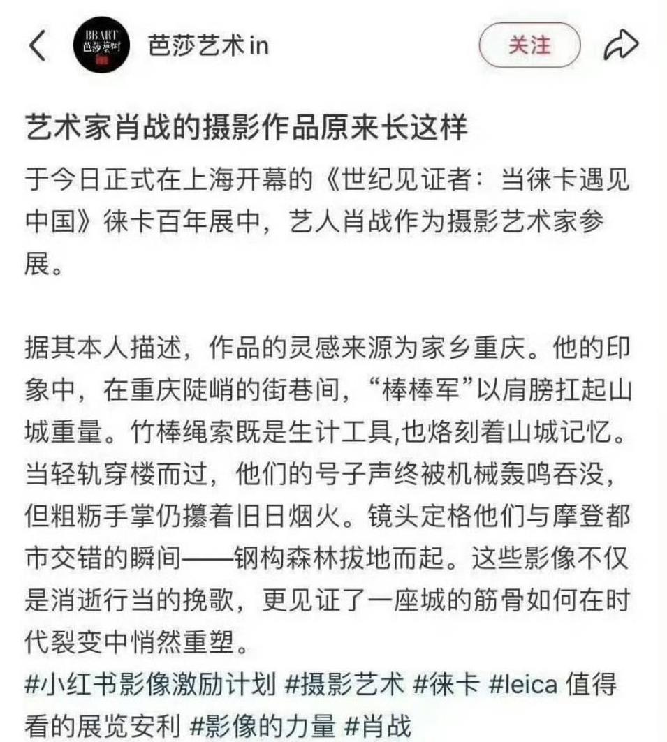 肖战的摄影作品在上海参展。 在上海开幕的《世纪见证者:当徕卡遇见中国》徕卡百年展中,肖战作为摄影艺术家参展。