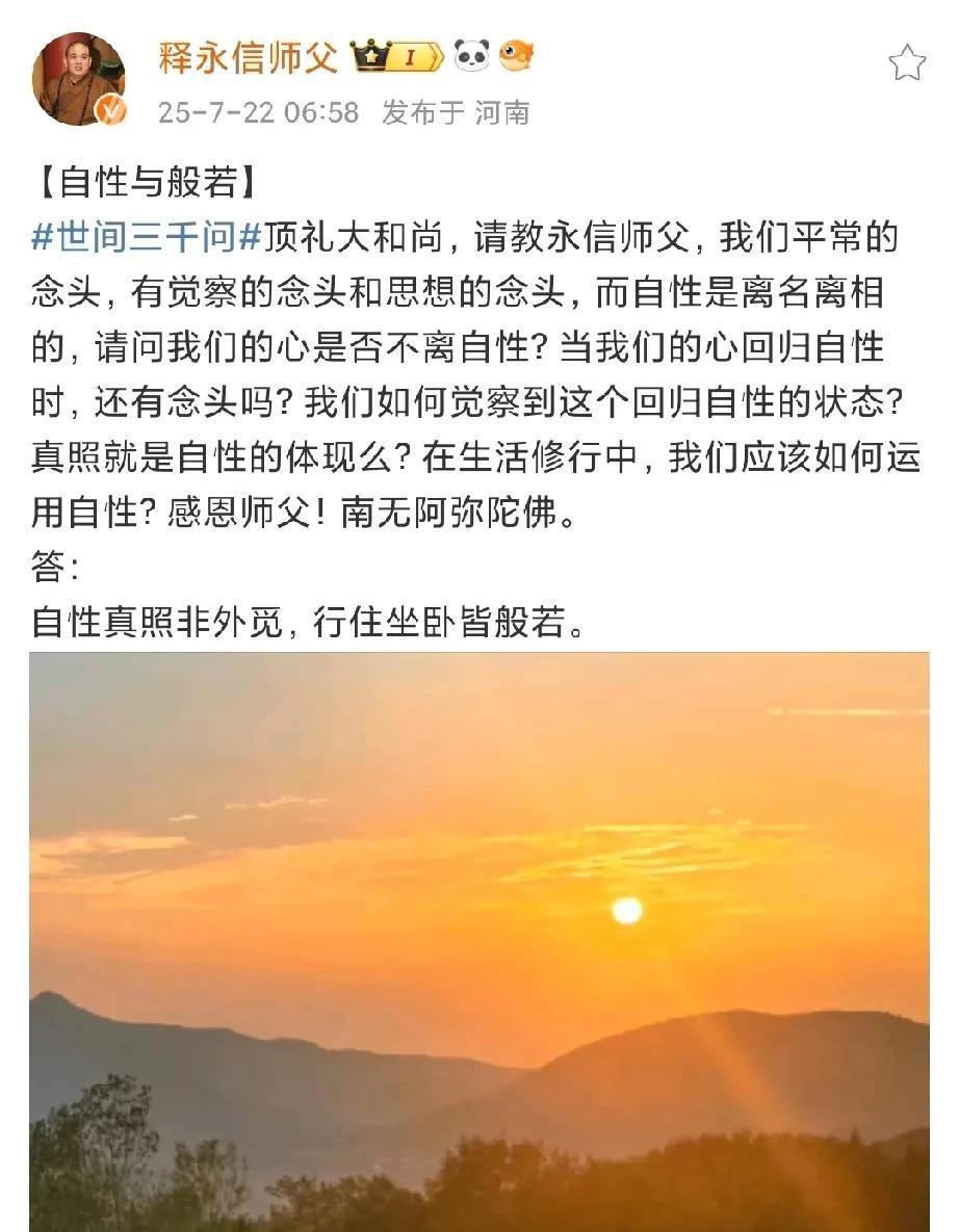 释永信曾坚持每天早起在社交媒体发文,7月24日之后停更 近日,网传释永信被警方带