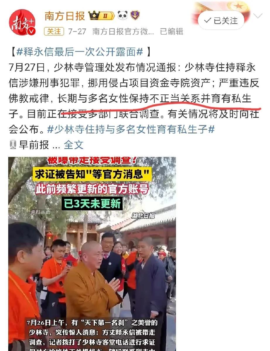 樊少皇发文配图虚竹头像,说的话有点微妙 7月28日下午,樊少皇在社交媒体发文,虽然主要是两张图一句话,似乎别有深意! 樊少皇发文说“我在这里”,然后晒出了自己的在798艺术区的定位; 而他配上了虚竹的头像,并且说了一句:天底下没有早知道,所有的知道都是最早的知道; 在评论区,樊少皇说这是四天前发的; 四天前是7月24日,而释永信据说是7月25日被带走…… 有一点微妙吧? 释永信被带走的事成为近两天的热点事件,媒体报道释永信长期与多名女性保持不正当关系并育有私生子。目前正在接受多部门联合调查。 网友说上一次少林出事还是北宋时期,少林方丈玄慈和叶二娘生了一个儿子叫虚竹…… 李国麟饰演鸠摩智,在剧中曾经指出少林寺的问题,被网友称为预言家,而李国麟发文回应“我不是预言家,不关我事啊!” 而樊少皇这番话,似乎和李国麟异曲同工吧? 看来对于少林方丈,鸠摩智有话说,虚竹也有话说啊……