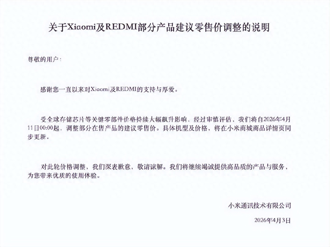 就在4月3日,小米正式官宣:受全球存储芯片等关键零部件价格持续大幅飙升影响,自2026年4月11日00:00起,调整部分在售产品的建议零售价。