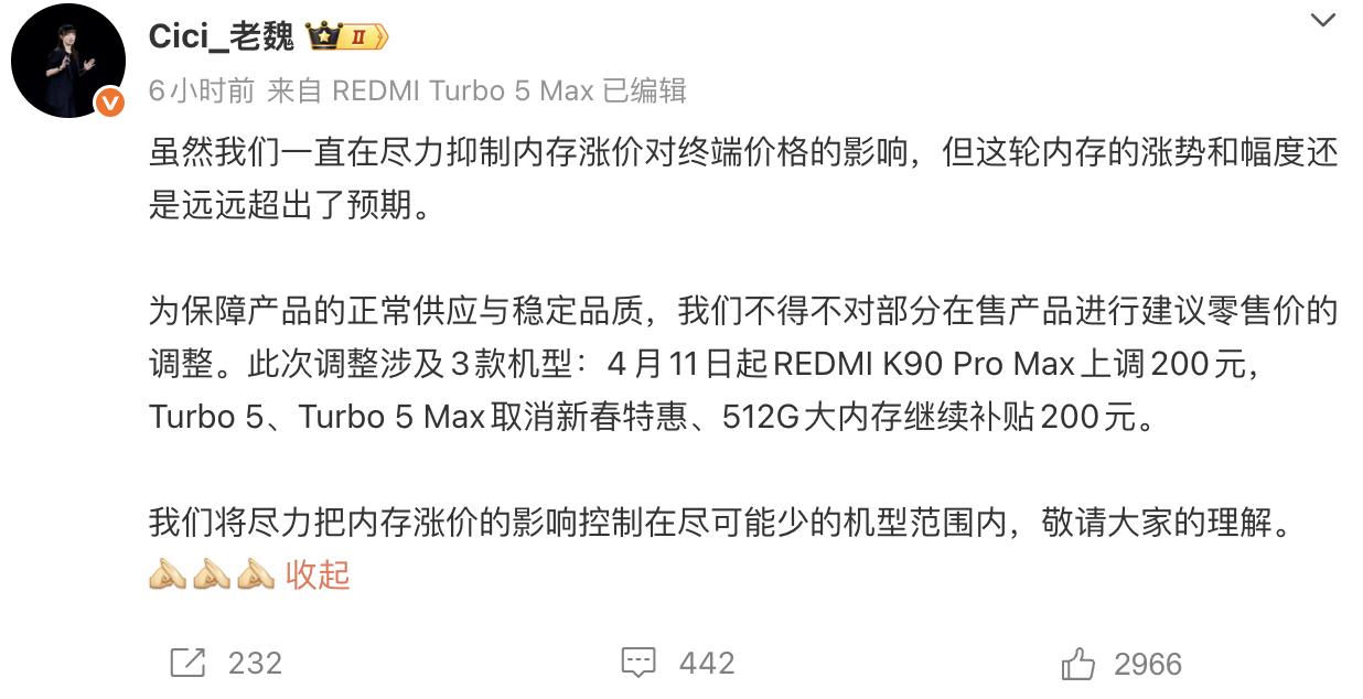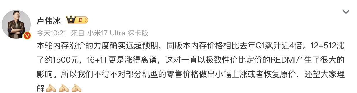 卢伟冰透露,12+512版本内存成本就涨了约1500元,小米自己扛了1300元,只让消费者多掏200元。小米中国区市场部总经理魏思琪表示,会尽力把影响控制在尽量少的机型范围内,但不排除后续扩大。