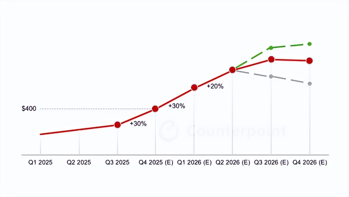 那么未来买手机会比2025年贵多少?Counterpoint预计,3月后中国市场新品手机均价较2025年同档位上涨15%-25%,入门级手机涨约206元,高端旗舰涨1030-1375元。