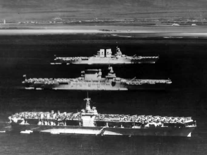 它也被称为“突击者”号,是为适应喷气式飞机起降而专门设计的。满载排水量超过8万吨,采用了斜角甲板、蒸汽弹射器等现代航母的标志性设计。服役后主要部署在太平洋,是越战期间美军的主力航母之一,因频繁参与作战行动而获得了13颗战星勋章。1991年海湾战争中,它搭载了近80架各型战机(包括F-14、A-6等),出动了3300多个架次,展现了强大的打击能力。