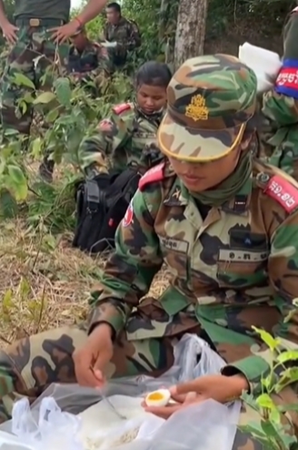 咸鸭蛋配白米饭,就是一顿饭! 泰国和柬埔寨已经停战,但是在前线的柬埔寨军队,仍然处于警戒状态!但是由于柬埔寨的国力太弱小了,导致前线官兵只能吃白米饭,连配菜都没有。女兵吃的咸鸭蛋,还是自己从后方带来的口粮,要不然只吃米饭,实在是没味道!