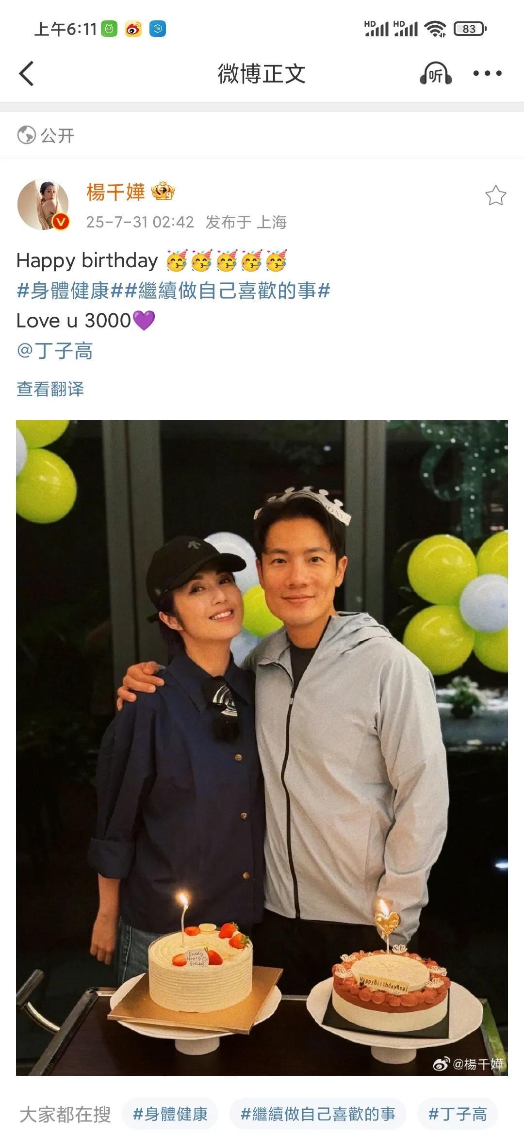 杨千嬅凌晨发文为丁子高庆生 7月31日凌晨,杨千嬅在社交媒体发文,为丁子高庆生。