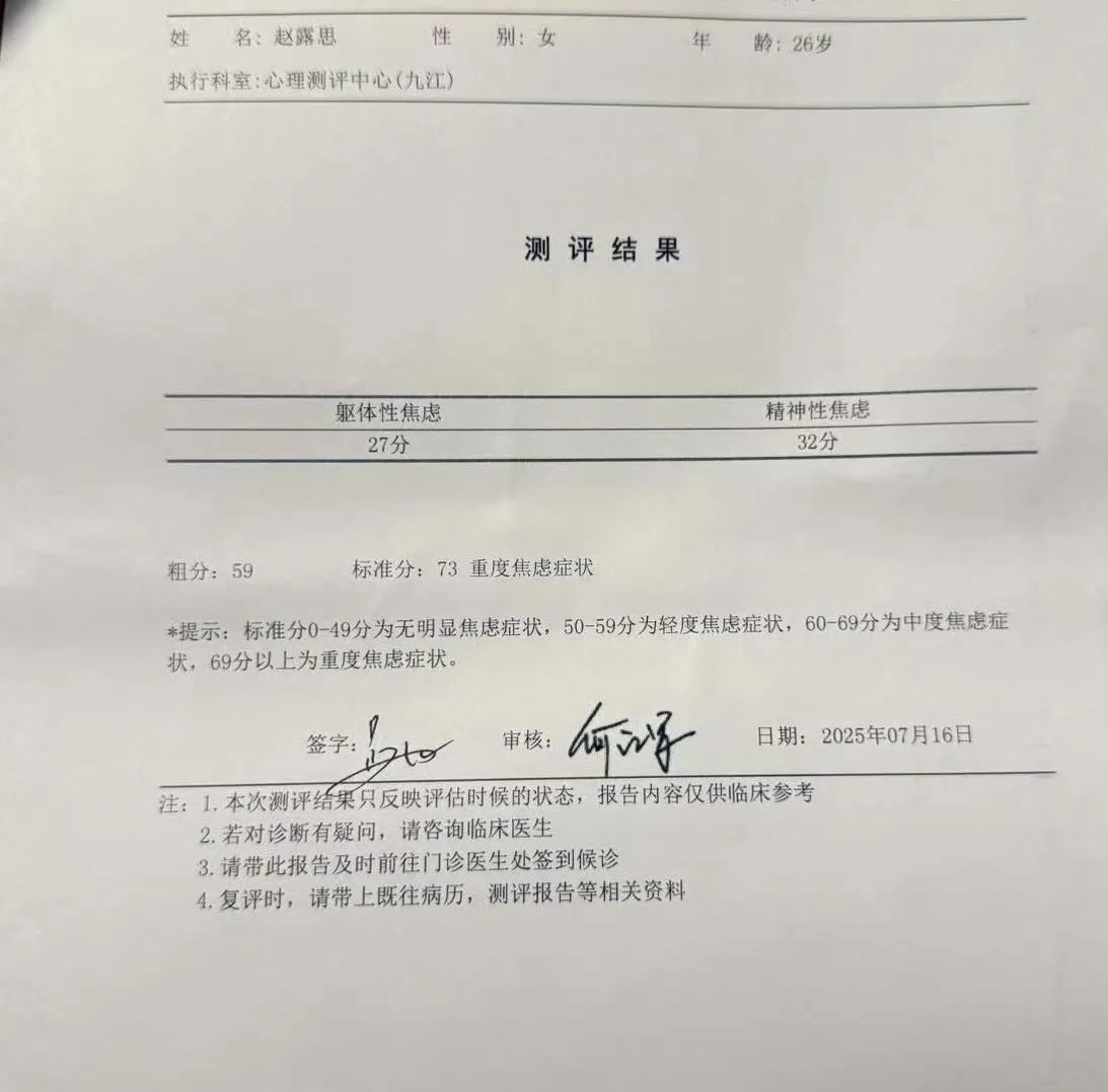 赵露思晒重度抑郁报告喊话公司:“我不干了!赵露思昨日晒出心理测评报告:重度焦虑7