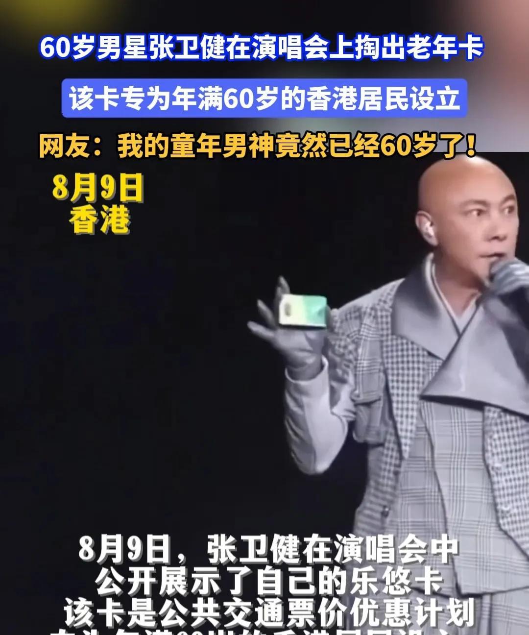 60岁张卫健红馆高调亮老年卡!自嘲"家有一老如有一宝"引爆笑泪! 8月9日,张卫健在BIG FOUR演唱会上突然掏出香港60岁长者专属"乐悠卡",幽默喊话:"乐悠卡在此,不得无礼!" 全场先是一愣,随即爆笑鼓掌。60岁的他活力不减,连唱《西游记》《真真假假》等经典,舞步生风,被赞"年龄60,状态30"。张卫健以自嘲化解年龄焦虑,笑称"别欺负老人家",队友接力调侃,现场温情又欢乐。网友感慨:"他掏出的不是老年卡,是一代人的青春回忆!#张卫健演唱会掏出“老年卡”# #张卫健演唱会掏出“老年卡”你惊讶吗# #香港明星卡# #明星卡片机# #张卫健# #何为港星魅力?#