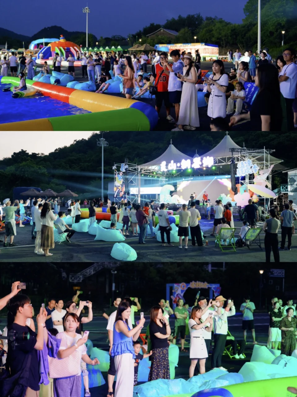 在景区停车场旁。现场不仅有儿童戏水区域,水枪大战、水上滑梯……还有美食集市,各种特色小吃琳琅满目