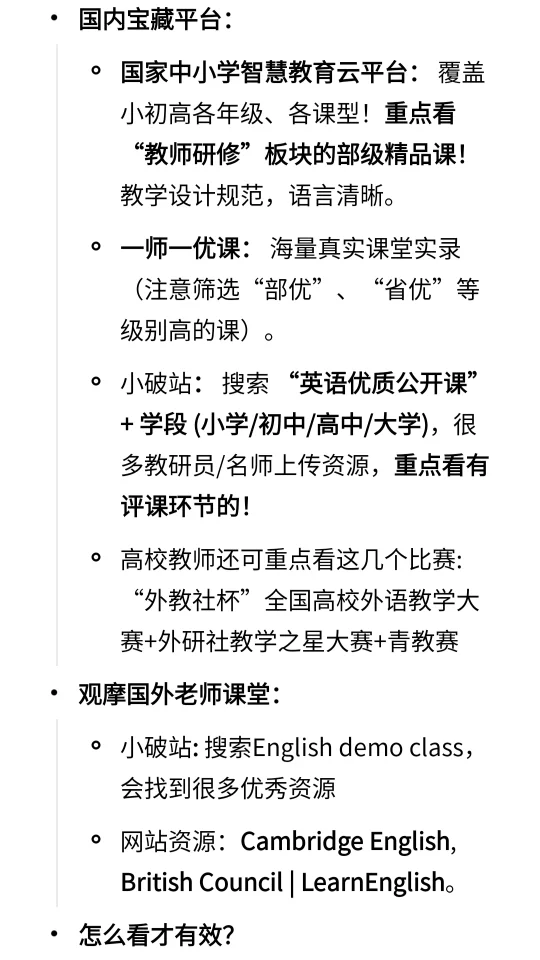 小破站: 搜索 “英语优.质公开课” + 学段 (小学/初中/高中/大学),很多教研员/名.师上传资源,重点看有评课环节的!