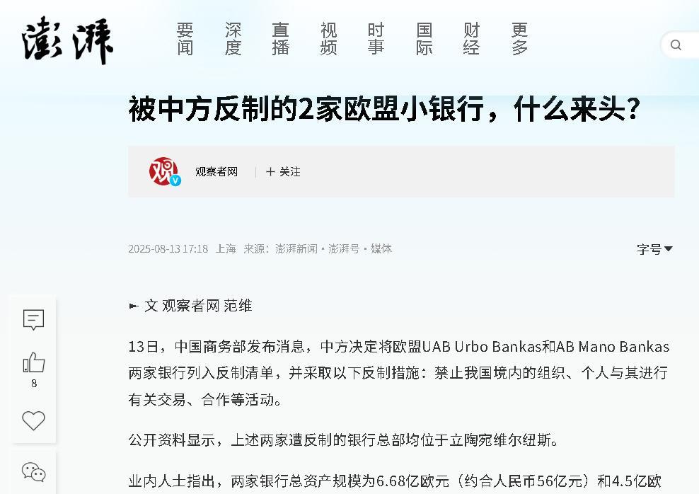[下雨]立陶宛那位行长收到制裁令时估计都懵了,他怎么也没想到,只是跟着欧盟对中国银行下了制裁,自家银行先上了中方反制清单。 其实事情很简单,欧盟以涉及俄罗斯为理由,对中国银行发起制裁动作。立陶宛积极参与,好像觉得站队会有好处。 谁料中国很快回击,直接把立陶宛的Urbo Bankas和Mano Bankas拉进了黑名单。 这两家银行体量说不上大,Urbo Bankas有68亿欧元,Mano Bankas四十五亿欧元,合起来甚至比不过中国一个城市商业银行。 可是禁令下来,跟中国企业和客户的资金往来全部被切断,对银行的影响马上就来了。 立陶宛其实早就吃过类似的亏。三年前由于和台湾有关的问题,被中国实施反制,对华出口一路下滑,跌到只有原来的零头。 结果国内很多木材厂被迫关闭,港口也变得冷清,那时候大家已经体会到外部制裁带来的压力了。 这会又遇到问题,超市里的牛奶涨价,港口设备闲置,也没什么船只来。 居民生活变得紧张,经济链条一头断了,另一头根本接不上,和平时相比,很多人都觉得日子难过了不少。 立陶宛为什么被选中反制?原因很直接,这个国家在欧盟里表现得最积极,但经济基础比较薄弱,只要打一下,影响就散开了。 中国用四天时间就做出回应,让立陶宛的银行迅速陷入困境,银行失去了中国资金来源,企业交易卡住,很多合作计划都被迫搁置。 对立陶宛来说,这样的打击几乎是难以应对的。过去遇到制裁,已经丢过不少工作机会,这次同样会让不少人陷入困境。 欧盟用俄罗斯当借口制裁中国,立陶宛觉得跟着大部队就有优势。但是现实摆在眼前,中国的反击越来越有针对性,直接让小国承担大风险,这让行长和政府都感到压力。 三年前的事情还历历在目,出口暴跌,工厂关停,港口停摆,现在银行资金断裂,业务慢慢萎缩。居民只看到物价一天天上涨,货轮越来越少,港口工人没活干,起重机也开始生锈。 银行受影响不止在金融业务上,后续一系列合作都要重新考虑。企业和客户本来依赖中国资金,现在都只能另寻出路。银行的资产表面看起来还稳定,其实很多资产已经受制于中国的禁令,实际运转远不如表面那么乐观。 维尔纽斯的街头变化很明显,每个人都感受到涨价和经济收缩。市民去超市发现牛奶价格持续变高,企业负责人焦头烂额,港口冷清没人气氛。大国博弈下,小国容易被牺牲,这已经不是第一次发生。 欧盟自己制定政策,立陶宛依赖集体,结果却成了第一个被反制的对象。中国有目标地做出选择,优先挑选弱点明显的小国,效果立竿见影。 整个事件一环扣一环,欧盟先发制裁,紧接着立陶宛参与,最终中国迅速回手,把立陶宛银行切断。 银行的资产数字看着挺大,但实际影响力伸出去有限,一旦被中国禁令覆盖,业务就很难持续发展。 老百姓日常生活首当其冲,牛奶价格抬高,连带其他商品也跟着上涨,港口不景气,设备没人用,工人渐渐失业。三年前和现在的区域差异并不大,都是经济遇到外部反制,国家承压,百姓买单。 这次中国对欧盟动作反应速度很快,优先选择表现突出但基础薄弱的立陶宛下手。过去的教训已经说明一切,这次银行被点名,小国也只能硬着头皮去扛。 现实是只要站队太高,风险就来了,经济压力开始加码,银行和企业都要接受资金断流的后果。 普通居民只有更高的生活成本,港口工人面对设备闲置,盼来的只有失业和等待。 立陶宛应该如何走下去,成了摆在每个居民、银行和政府面前的难题。大国之间的博弈,小国要是没准备好,可能下一步还会遇到更多被动局面。 你觉得立陶宛到底怎么破解现在的困局?可以评论发表你的看法。#MCN双量进阶计划#
