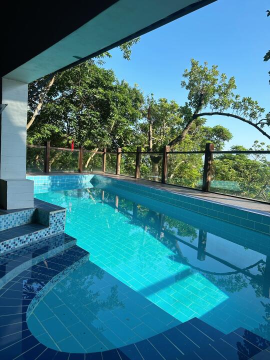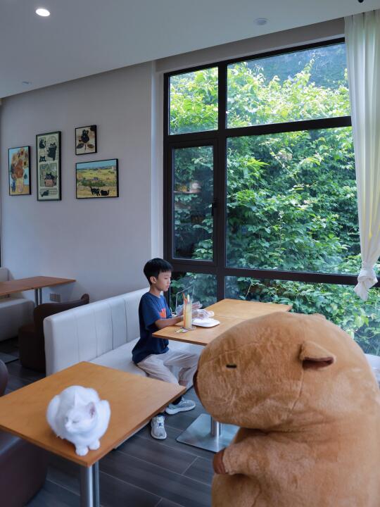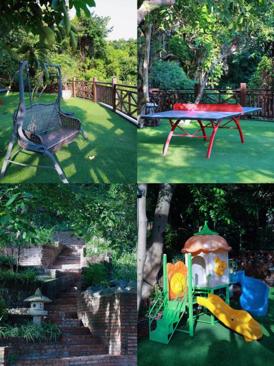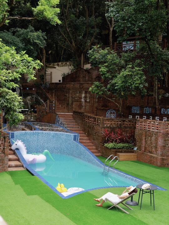 🔹设施丰富,餐厅+天然山水泳池+房间泡池+户外花园温泉+儿童游玩设施+猫咖,在民宿里就可以玩上半天了,还有超多好看的打卡机位