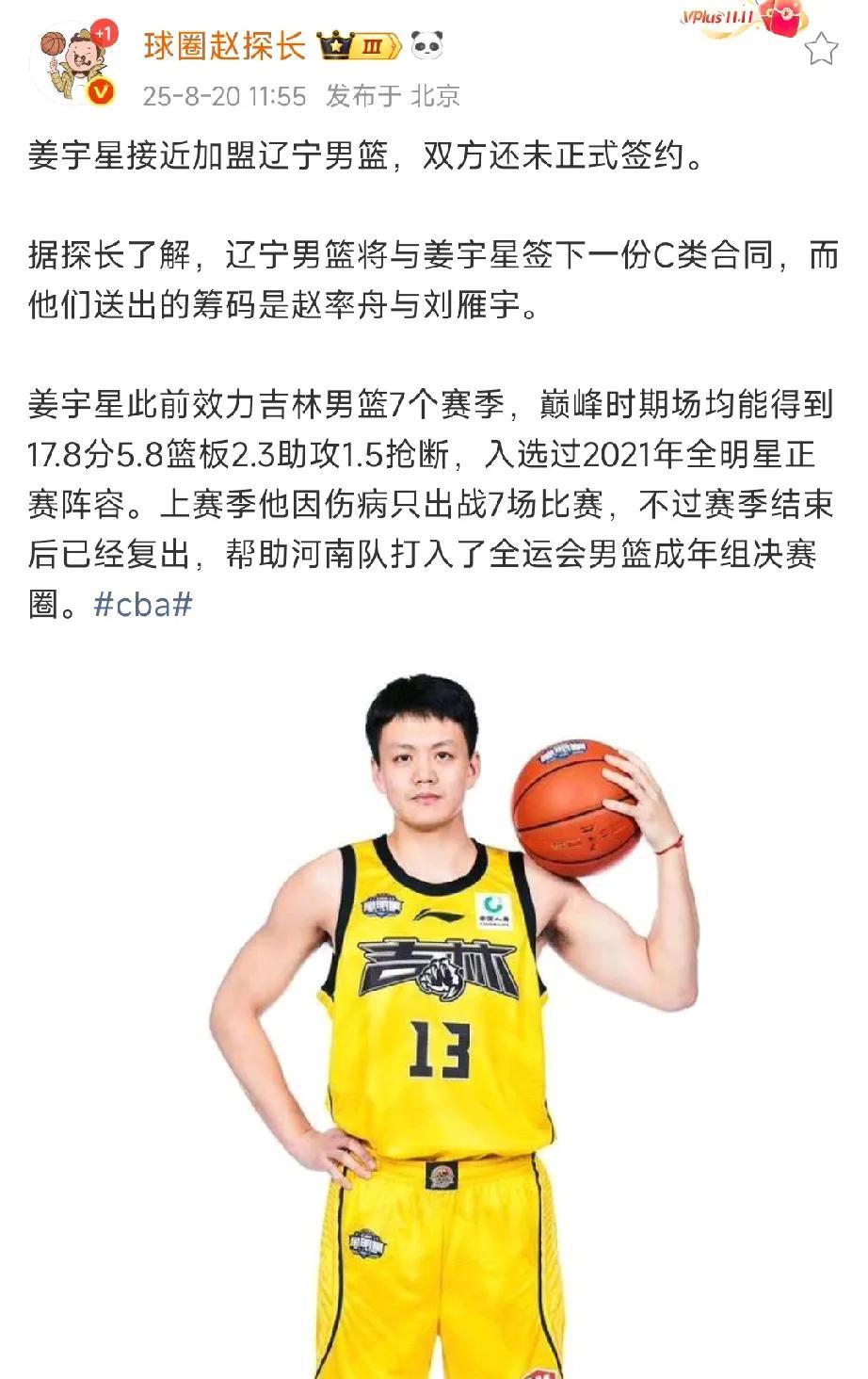 恕我直言,辽宁男篮小刘总有cba小诸葛之称,拿下姜宇星交易评分,我认为至少是B+,特别送刘雁宇去吉林练级,据媒体人透露:姜宇星加盟辽宁男篮,作为老对手,猜测杜锋一定会有所忌惮了吧,在辽宁2-3号位上又新添场均15分的即战力!我建议姜宇星加盟辽宁男篮穿13号球衣,赵继伟在后场,二号位是姜宇星,三号位张镇麟,辽宁男篮甚至能启用双大外援的阵容,甚至赵继伟和姜宇星能各自带领一套阵容!辽篮后场能持球的球员多达6人,包括:赵继伟、王岚嵚、鄢手帝、姜宇星和两小外援,遇到广东宏远后卫胡明轩,姜宇星直接对位,突破杀伤极大程度解放赵继伟的火力,也会忌惮三分。