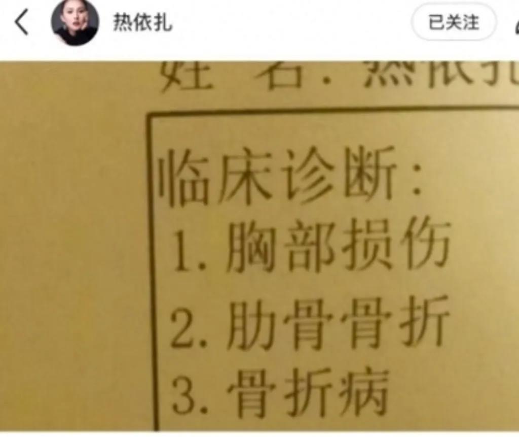 热依扎自曝胸部损伤肋骨骨折,坚强表示“没放弃好好生活”!8月24日凌晨,演员热依扎在社交平台晒出临床诊断书,结果显示“胸部损伤、肋骨骨折、骨折病”。她配文称:“爱你们,但真的不是卖惨,说多了都是故事,但也真的没放弃好好生活。”热依扎还在评论区透露,伤情“其实有段时间了”,经过思量才决定告知大家。网友纷纷送上祝福:“姐姐一定要好好休息,早日康复!#热依扎晒诊断病历 显示肋骨骨折# #热依扎# #spes热依扎# #热依扎演技# #巩留热依扎# #新疆巴扎热依汗# #建水肋骨骨折# #胳膊骨折吊带#
