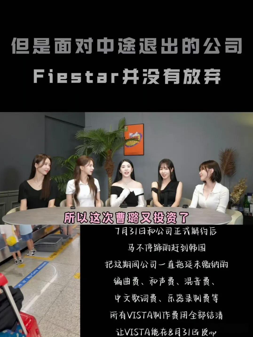 《曹璐更新vlog曝FIESTAR回归波折:签约新公司半年备战回归,原计划五六月复出且已完成编曲、录音、排练,却因公司原因遗憾解约;为让组合新版出道曲《VISTA》如期上线,她自掏腰包结清所有制作费用,成员透露新歌将“兴奋又充满力量”,8月31日上线引期待》