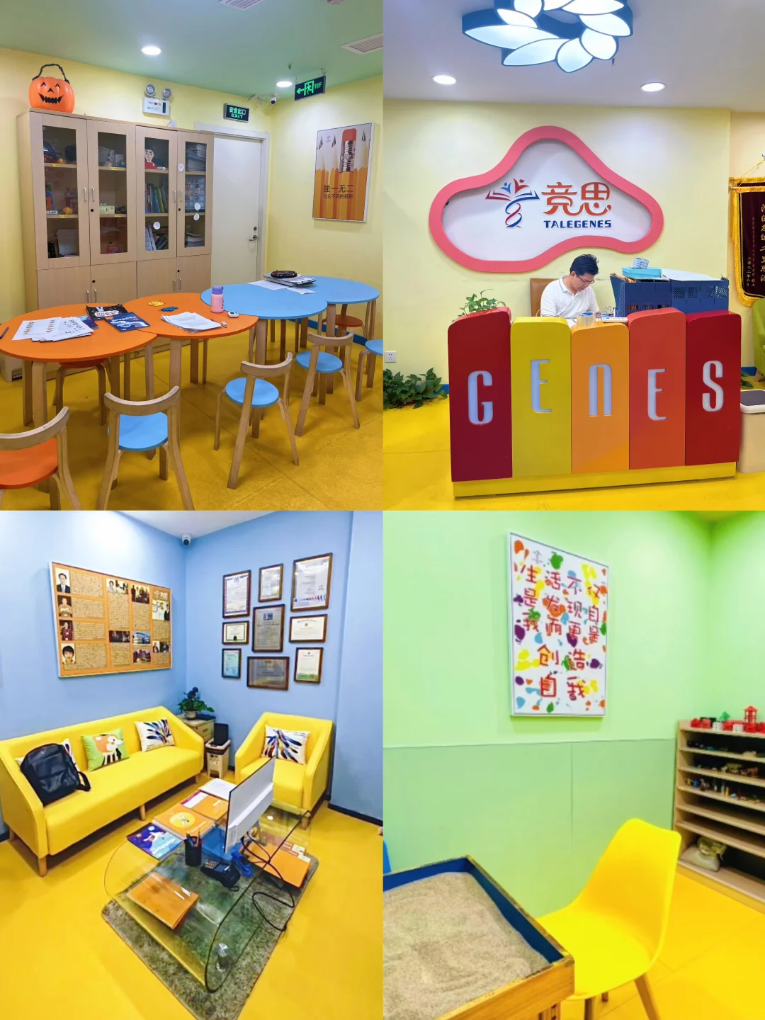 1️⃣ 氛围超温馨:教室是明亮的马卡龙色系,没有压迫感,娃一进去就被各种益智教具吸引住了~