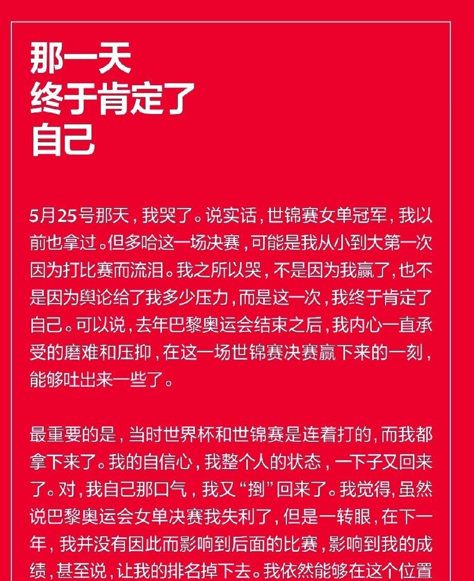 莎莎杂志最新采访片段,真的是干货满满,看哭多少球迷?[流泪][流泪] 她说: “那一天终于肯定了自己” “被冲击也要习惯站在前面” “把那两个画面写进我的自传” “为了洛杉矶 但不只为了洛杉矶” "我是快乐的" 这一句话适合所有人:“每一场比赛,我要打败的都不是对手,而是前一场的我。” 每个人每天面对的,无论是学业,工作,还是琐碎的生活中的自己,只要今天比昨天好,今天比昨天要更明媚,那我们就是每天都进步一点点!哪怕暂时遇到困难,暂时遇到挫折也不可怕,勇往直前,明天总会有个崭新的自己!这就是生活的信念! 坐等莎莎的自传!书柜里总有一角的位置是留给她的!!加油![加油][加油]