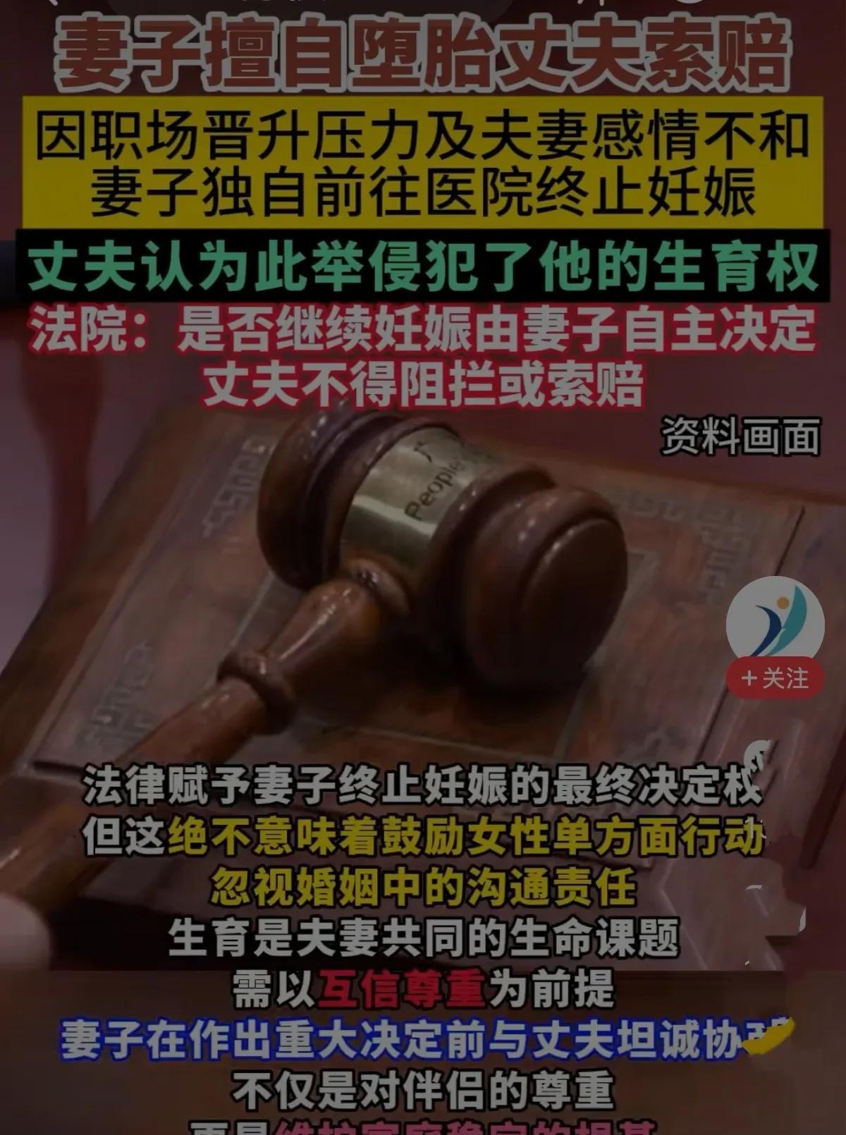 北京,女子事业心特强,结婚多年未生孩子,把精力都用于工作和加薪晋级中,丈夫因此有些抱怨,两人感情产生间隙。而正处于职场晋升的关键时刻,女子发现自己怀孕后,没告诉丈夫偷偷去医院终止了妊娠。丈夫得知后非常生气,一怒之下把她告上法庭,认为妻子侵犯了他的生育权,要求精神损害赔偿,并主张离婚。而法院判决让他无法接受! 据时速新闻8月23日报道,刘女士发现怀孕,并没有即将成为母亲的喜悦,而是擅自去医院堕胎,这下惹恼了丈夫,认为妻子侵犯他的生育权,夫妻俩因此对簿公堂!法院判决引热议! 刘女士与丈夫季先生是大学同学,结婚多年,起初两人恩恩爱爱,生活的幸福甜美。 季先生是体制内的,温文尔雅,沉稳谦和。而刘女士属于那种争强好胜,精明干练,做事不服输的女人。 她是工作上特拼的那种,所以在职场摸爬滚打,靠不把自己当女人的那股狠劲,在公司混得风生水起。 而结婚多年,季先生一直想要个孩子,与刘女士提过多次,她不是说忙就是说没时间,要不然就说再等等:等项目做完、等我升总监! 季先生一听这些话就生气:工作有做完的时候吗?什么样的职位能达到你的满意?别太拼了,身体要紧,咱们有了孩子就圆满了,安稳过日子多好! 刘女士却认为在能拼的年龄必须抓住机会,季先生认为,在最佳生育年龄生个健康的宝宝才是最明智的选择。 两人因为孩子没少吵架,因此让彼此感情有了间隙与疏远。 最近几个月,俩人几乎没怎么好好说话。刘女士早出晚归,回家要么对着电脑加班,要么累得倒头就睡。 季先生从一开始的抱怨变成了沉默,晚饭要么自己在单位吃,要么回家煮碗面,客厅里的灯常常亮到后半夜,却只有他一个人在看电视。 夫妻间的爱与温情,理解与默契似乎在冷漠中消耗殆尽。 然而,2025年初,刘女士竟发现自己怀孕了,但她没有一丝即将成为母亲的喜悦! 自己正处在公司晋升的关键时刻,多少人盯着那个位置!自己能有这个成绩,靠的就是比别人能扛,比别人能牺牲!可丈夫不理解,让她对婚姻很失望! 因职场晋升的压力及夫妻感情不和,她决定终止妊娠。 于是,她未让丈夫知道,偷偷独自去了医院,做了堕 胎手术。 回到家,细心的丈夫就看到她脸色煞白,在他的追问下,她坦白了真相。 季先生一听暴跳如雷,随后蹲在床边痛哭起来。他盼了很多年的孩子,在他不知情的情况下就没了,你为什么那么狠?你到底拿我当什么? 而刘女士并不觉得亏欠,她说这孩子在自己肚子里,去留当然自己说的算。 季先生跳起来说:这孩子是咱们俩的,你凭什么自己做决定?你没这个权利? 刘女士不听他那套说辞,收拾了东西回了娘家。 季先生越想越憋气,婚姻给他他什么?自己连要个孩子的权利都没有了吗? 愤怒之下,以妻子侵犯了他的生育权为由,一纸诉状将她告上法庭,要求精神损害赔偿并主张离婚。 法院审理认为:《妇女权益保障法》第32条规定:妇女依法享有生育子女的权利,也有不生育子女的自由。 女性生育权的核心是身体自由权、身体自主权。 虽夫妻双方都有生育权,然而丈夫的生育权实现必须以妻子自愿为前提。 是否继续妊娠这一最终决定权掌握在女性手中,丈夫不得进行阻拦,也不能因为妻子独自决定终止妊娠而索赔。 刘女士她意外怀孕后,基于自身职场晋升压力及夫妻感情不和等因素,独自前往医院终止妊娠,这一行为在法律上是其行使自身生育自由权的体现,丈夫不能以侵犯其生育权为由要求精神损害赔偿。 即便出现丈夫不愿生育而妻子坚持分娩的情况,男方仍需承担抚养责任,因为子女的抚养义务不因父母对生育意愿的分歧而免除。 《民法典》第1082条规定:女方在怀孕期间、分娩后一年内或者终止妊娠后六个月内,男方不得提出离婚。 女方提出离婚或者人民法院认为确有必要受理男方离婚请求的除外。 女方在怀孕、分娩及终止妊娠后身体和心理都处于相对脆弱的状态时,需要一定的保护和稳定的环境。因此男方在女方特定生理时期提出离婚是有限制的。 若没有女方提出离婚或者人民法院认为确有必要受理男方离婚请求等例外情形,男方在终止妊娠后6个月内提出的离婚诉讼,法院不予受理。 《民法典》第1043条明确规定:夫妻应当互相忠实,互相尊重,互相关爱;家庭成员间应当敬老爱幼,互相帮助,维护平等、和睦、文明的婚姻家庭关系。 法律赋予妻子终止妊娠的最终决定权,但这并不意味着鼓励女性单方面做出行为而忽视婚姻中的沟通责任。 生育是夫妻共同的生命话题,关乎家庭的未来和发展,需要以信任、尊重为前提。 妻子在做出终止妊娠这类重大决定前与丈夫坦诚协商,既是对伴侣的尊重,也是维护家庭稳定的根基。 最后法院判决:是否终止妊娠由妻子自主决定,丈夫不得阻止或索赔,驳回季先生精神损害赔偿的诉求和主张离婚的请求。 有人说,那男人出车出房出彩礼,得到了什么权利? 还有人说,男人到底能决定什么? 对此您怎么看?