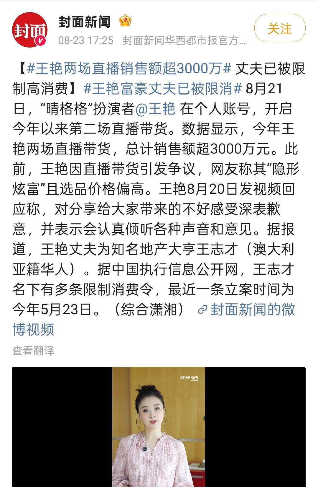 老公成老赖是不是加入豪门女星的统一归宿,又一个嫁入豪门的女星老公暴雷了,曾经炫富自家能看到故宫,现在老公被限制高消费,看多了这种事情好像也见怪不怪了。 前两年还刷到不少说什么王艳家住北京市中心,距离故宫5百米,还能看到故宫的炫富通稿,现在她的丈夫已经被限制高消费了。 按照息影后多年突然冒出来的规律来看,十有八九是要出来捞金了,特别是嫁入豪门的女星,突然出来卖情怀八成就是婆家出事,现在王艳也出来带货,果不其然其丈夫出事了。 刘涛当年也是嫁人后突然疯狂出来拍戏上节目,就是因为老公出事为老公还债,这豪门也太容易暴雷了。