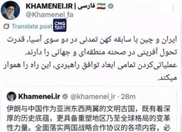 伊朗总统迟到后,哈梅内伊发中文谈中伊关系,伊朗内部裂痕加大? 31日晚间,上合峰会招待晚宴开幕后,伊朗总统佩泽希齐扬的专机才姗姗来迟,落地天津。这也让佩泽希齐扬错过了这顿由中方主持的晚宴,以及晚宴前的全家福大合影。 不过,有据称是佩泽希齐扬外交团队的人解释说,他们早就准备好了迟到参加峰会,并且坚称开场的合影照和晚宴都是“不重要且没有意义的活动”。不少伊朗人也因此在网上怒骂佩泽希齐扬是“国际小丑”、“只顾讨好美西方,没有资格当总统”,因为他竟然在这么重要的场合,当着全球20多国领导人和联合国秘书长等国际组织负责人的面迟到,丢尽了伊朗的脸面。考虑到能在X等社媒上用英语发文的大多是伊朗的亲西方人士,这对于这位“开明派”总统的支持率应该会有一定的打击。 不过,哈梅内伊却很给中国面子。他特意在社媒上用波斯语和中文发文阐述了中伊关系,并表示,中伊两国都是文明古国,更具备重塑地区乃至全球格局的变革性力量,并提到要全面落实两国战略合作协议的各项内容。#哈梅内伊为何罕见用中文发帖# 这种举动本身就极具深意,不仅是外交上的友好姿态,更彰显了伊朗最高领导人对中国的重视,以及希望加强双边关系的积极态度。显然,哈梅内伊希望两国双边关系可以迈向新高度,展开更加紧密和深入的合作,为地区和全球发展带来更多积极影响。而最高领导人与总统的态度之间体现出的微妙不同,似乎也预示着伊朗内部的裂痕正在加大,一方更重视与“全球南方国家”的合作,另一方却似乎还要押注美国,这对于伊朗来说,恐怕不是什么好事。#晒图笔记大赛#