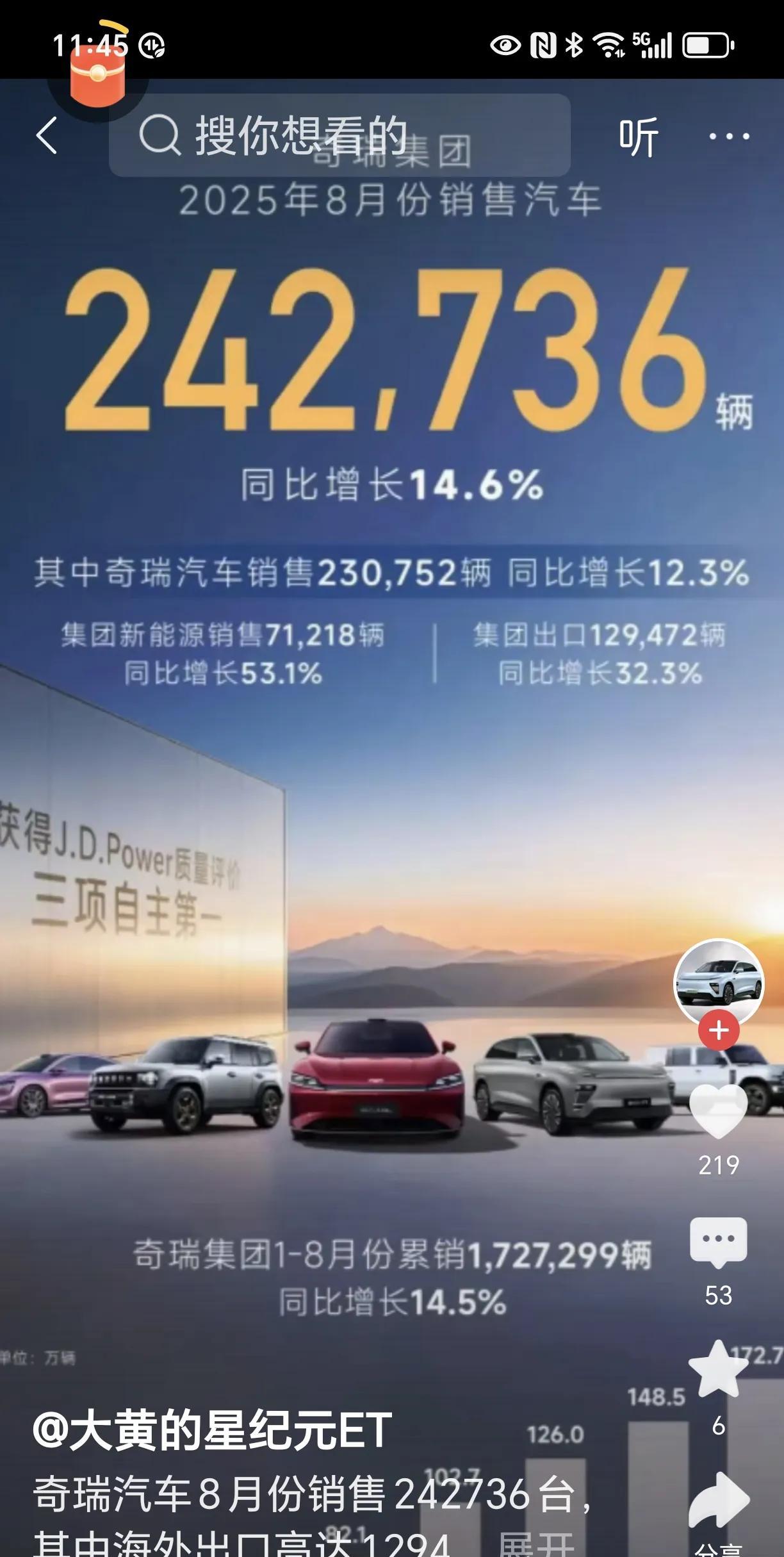 奇瑞汽车董事长宣布,8月奇瑞汽车月销量突破24万台,其中超13万台出口海外。这一