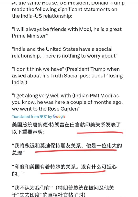 特朗普对印度改口了!来了一趟中国,印度收获意外之喜!9月6日,根据外媒报道,外媒称,在白宫,美国总统特朗普就印美关系发表了以下重要声明。特朗普表示,我将永远是莫迪的朋友,他是一位伟大的总理,印度和美国有着特殊的关系。没什么好担心的。我不认为我们有美国失去印度。