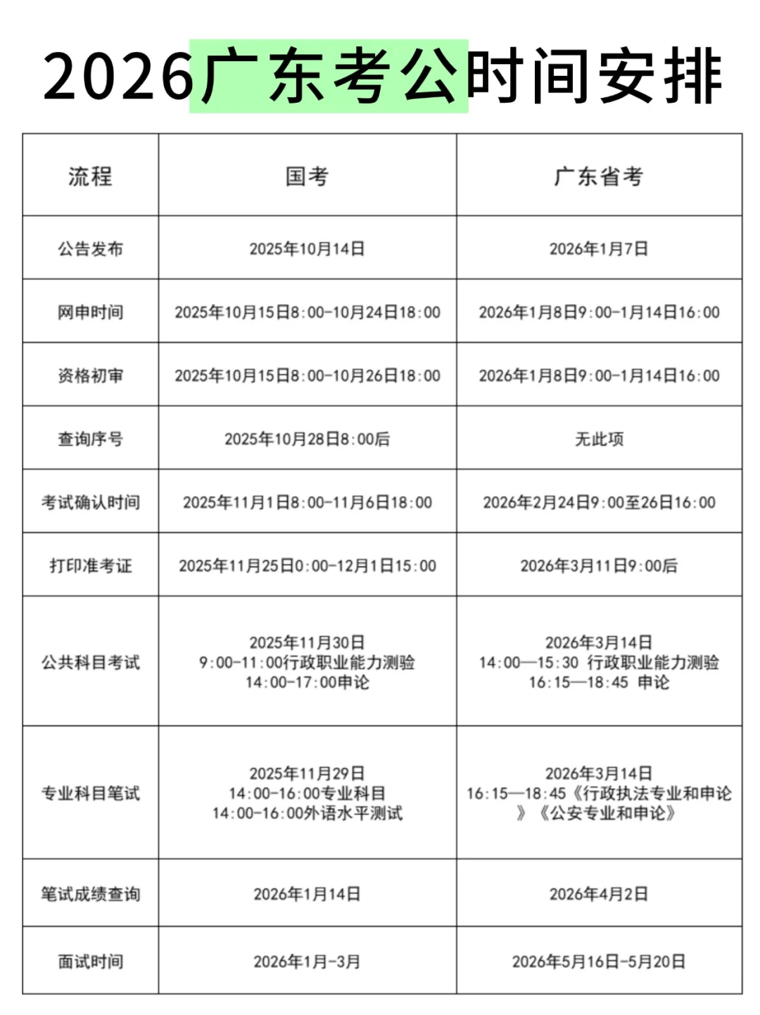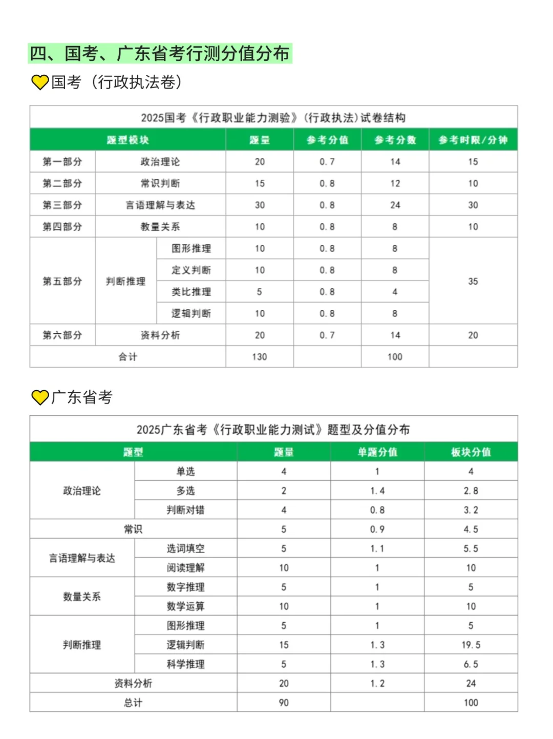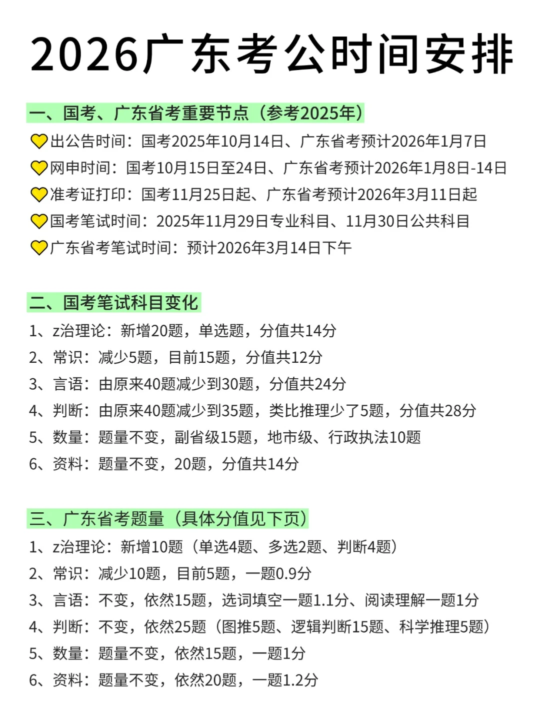 ⭕⭕ 广东省考行测 考试时长:行测90分钟、申论150分钟 💡1、z治理论 题量:10题(单选4题、多选2题、判断4题) 分值:单选一题1分、多选一题1.4分(错选、多选、少选均不得分)、判断一题0.8分 💡2、常识 题量:5题 分值:一题0.9分 💡3、言语 题量:15题(选词填空5题、阅读理解10题) 分值:选词填空一题1.1分、阅读理解一题1分 💡4、判断 题量:25题(图推5题、逻辑判断15题、科学推理5题) 分值:图推一题1分、逻辑判断一题1.3分、科学推理一题1.3分 💡5、数量 题量:15题 分值:一题1分 💡6、资料 题量:20题 分值:一题1.2分 . ⭕⭕ 国考、广东省考重要节点(参考2025) 1、公告发布时间:国考2025年10月14日、广东省考预计2026年1月7日 2、网申时间:国考10月15日至24日、广东省考预计2026年1月8日-14日 3、考试确认时间:国考11月1日至6日、广东省考预计2026年2月24日-26日 4、准考证打印:国考11月25日起、广东省考预计2026年3月11日起 5、笔试时间 国考:2025年11月29日专业科目、11月30日公共科目 广东省考:预计2026年3月14日下午 考公 广东省考 国考 国省考 考编 大三 公考 广东考公 26广东省考 应届生