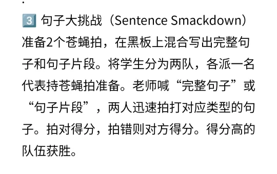 准备2个苍蝇拍,在黑板上混合写出完整句子和句子片段。将学生分为两队,各派一名代表持苍蝇拍准备。老师喊“完整句子”或“句子片段”,两人迅速拍打对应类型的句子。拍对得分,拍错则对方得分。得分高的队伍获胜。