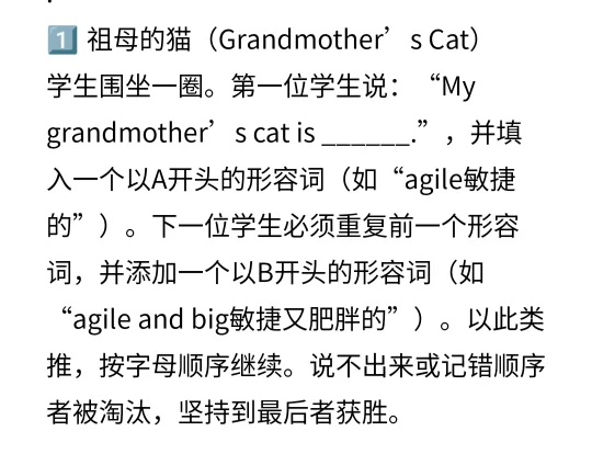 学生围坐一圈。第①位学生说:“My grandmother’s cat is ______.”,并填入一个以A开头的形容词(如“agile敏捷的”)。下一位学生要重复前一个形容词,并添加一个以B开头的形容词(如“agile and big敏捷又肥胖的”)。以此类推,按字母顺序继续。说不出来或记错顺序者被淘汰,坚持到坠后者获胜。