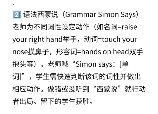 老师为不同词性设定动作(如名词=raise your right hand举手,动词=touch your nose摸鼻子,形容词=hands on head双手抱头等)。老师喊“Simon says:[单词]”,学生需快 速判断该词的词性并做出相应动作。做错或没听到“西蒙说”就行动者出局。留下的学生获胜。
