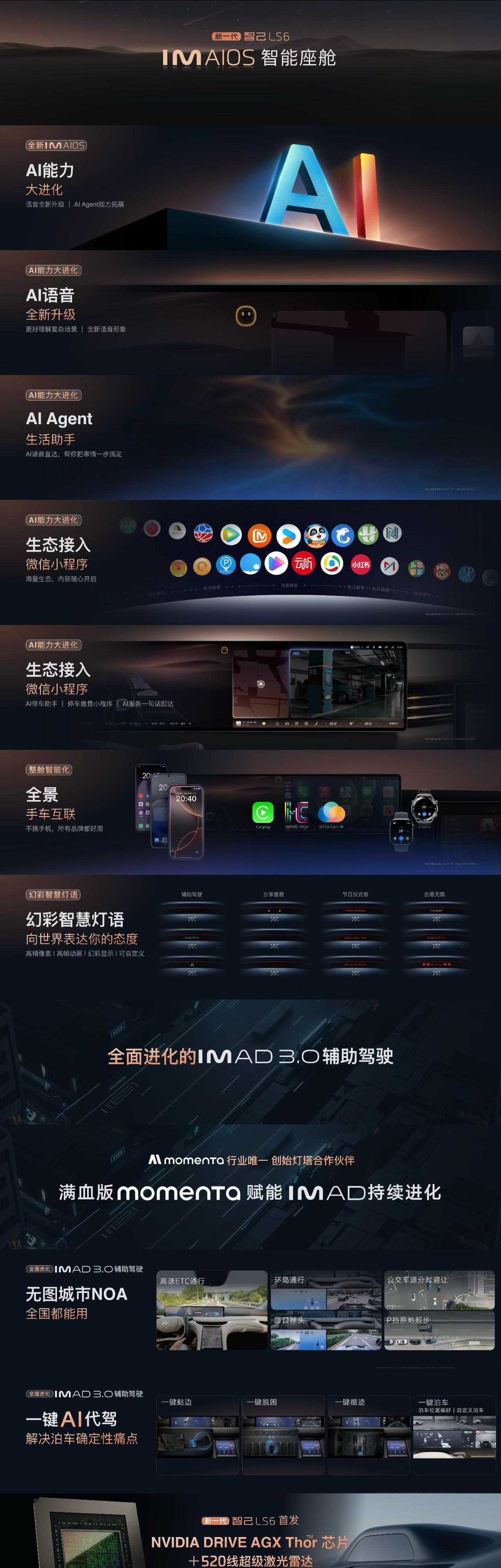 9月10日,全新智己LS6正式上市,共推出9款配置,上市权益价19.79万元起。新车首次提供纯电与增程双动力选择,即日起开启交付。 外观方面,新车采用最新设计语言,纯电版配备封闭式前脸与T字形猎鹰智慧灯光2.0系统,增程版尺寸略高2mm。车身长宽高为4937/1988(纯电1671mm/增程1673mm),轴距均为2960mm,轿跑SUV造型搭配上翘鸭尾和大型尾灯。 内饰全面升级,搭载27.1英寸5K中控双联屏+15.6英寸3K副驾娱乐屏,配备AIOS1.0交互系统,提供半辐/全辐方向盘可选。副驾支持121°零重力座椅并可向前翻折,释放后排超1米腿部空间,同时配备11L冷暖冰箱。 智能驾驶采用Momenta满血方案,至高可选520线激光雷达与英伟达Thor芯片,支持IMAD3.0系统,含城市NOA、横向避让及一键AI泊车等功能。 动力系统: 纯电版:单电机245kW/430N·m,配76kWh电池,续航650km;双电机前后200kW+300kW,配103kWh电池,续航750km。 增程版:搭载1.5T发动机(155马力)+电机(313马力),配备宁德时代专属电池,纯电续航370km/450km,综合续航最高1502km。【来自懂车帝车友圈】