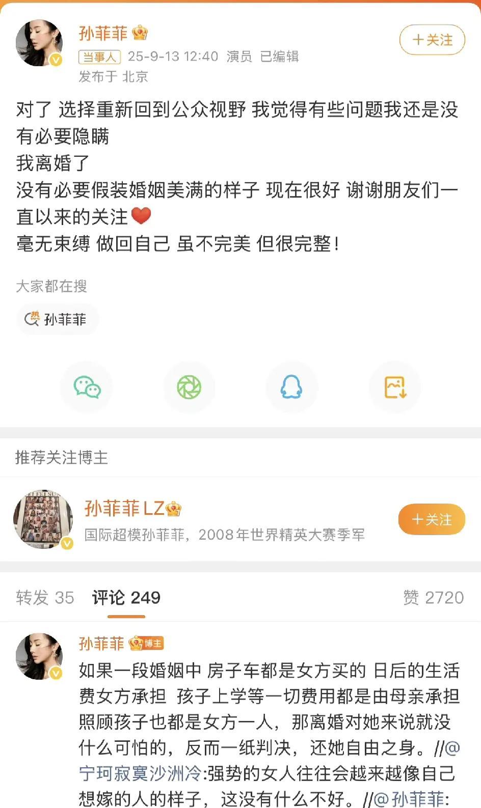 孙菲菲离婚:告别“假装美满”,她终于做回自己!都说娱乐圈离婚总要撕得难看,可孙菲菲的离婚宣言却让人眼前一亮——原来分手也可以如此体面她简单一句“我离婚了”,不卖惨不遮掩,直接撕掉了明星必须“婚姻美满”的假面。不要假装幸福,不要勉强凑合,有勇气结束,更有底气重新开始!#孙菲菲官宣离婚# #孙菲菲# #王阳孙菲菲# #演员离婚# #韩菲菲#