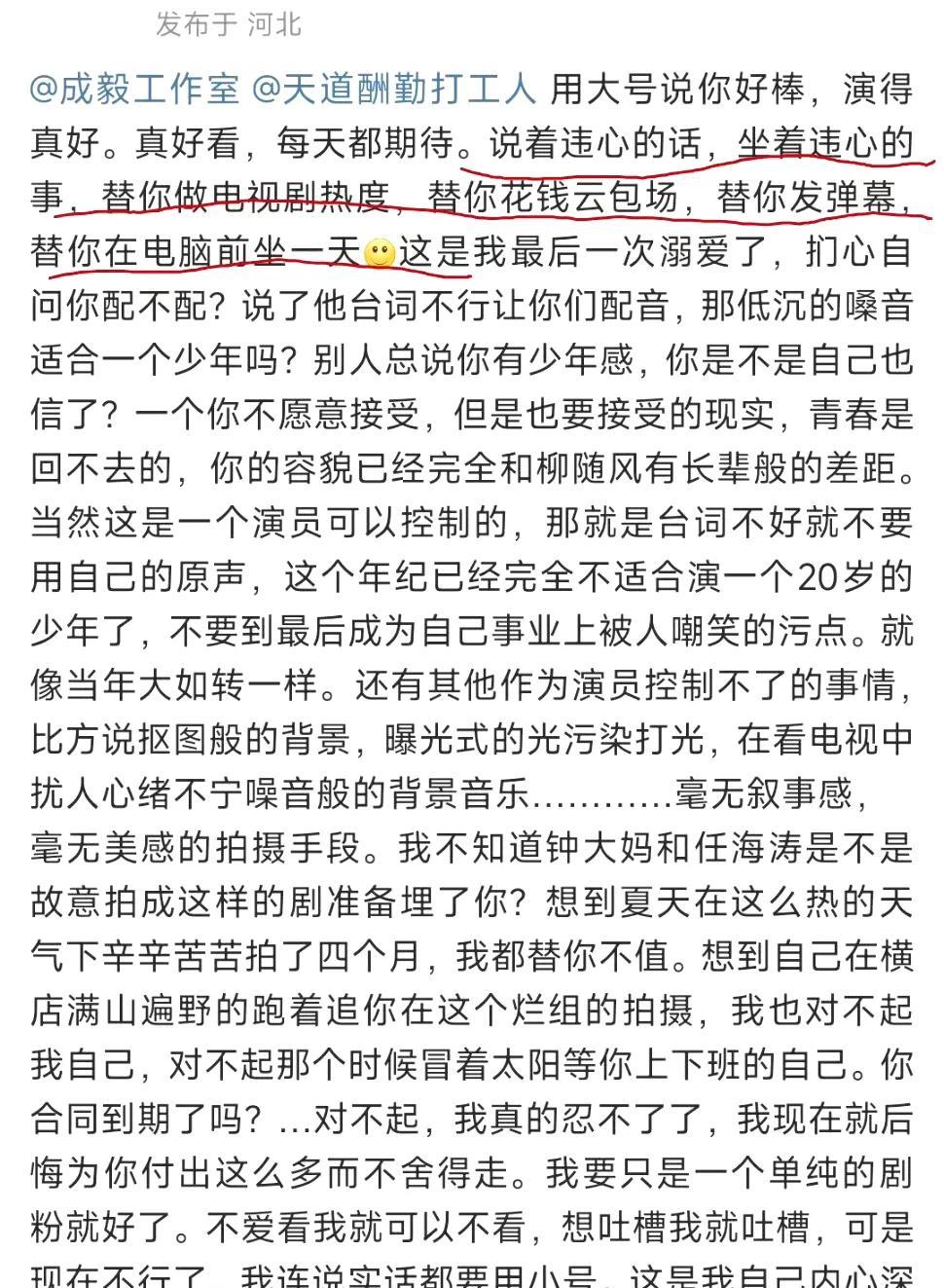 看吧,连成毅的大粉也觉得《赴山海》很烂! 2.青春是回不去的,成毅的容貌已经完全和柳随风有长辈般的差距。 3.抠图般的背景,曝光式的光污染打光,扰人心绪不宁噪音般的背景音乐……毫无叙事感,毫无美感的拍摄手段。 说真的,像她们这种大粉,做得已经够好了, 哪怕剧质量让人这么失望, 她们依然在坚持做数据、反黑、撑热度。 说到底,不过是希望成毅能走得更好罢了。