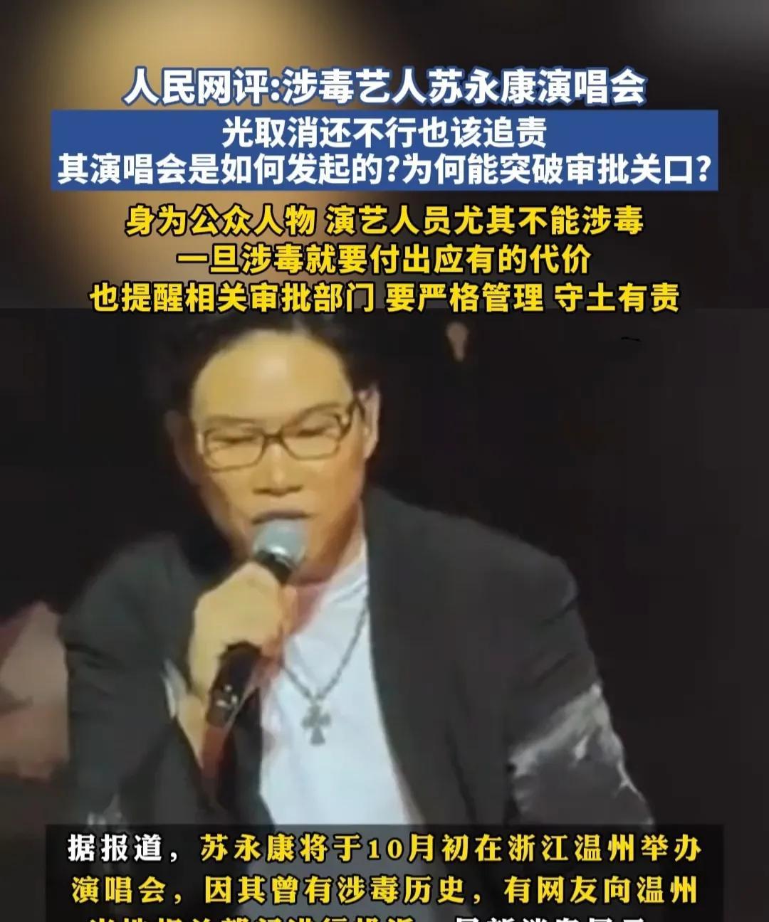 情歌王子变涉毒艺人,苏永康温州演唱会被取消!曾经唱着《男人不该让女人流泪》的“情歌王子”苏永康,如今却因涉毒历史遭网友抵制,温州演唱会突然下架!人民网直言:光取消不够,必须追责! 一个连网友都记得的涉毒劣迹,为何能通过省厅审批?背后漏洞比艺人复出更值得警惕,二十年前吸毒被捕,二十年后想内地捞金?网友用行动证明:有些错,时间也抹不平。对涉毒零容忍,才是对缉毒英雄最大的尊重。#人民网评涉毒艺人苏永康演唱会取消# #苏永康出场费# #苏永康出场费# #苏州演唱会取消#