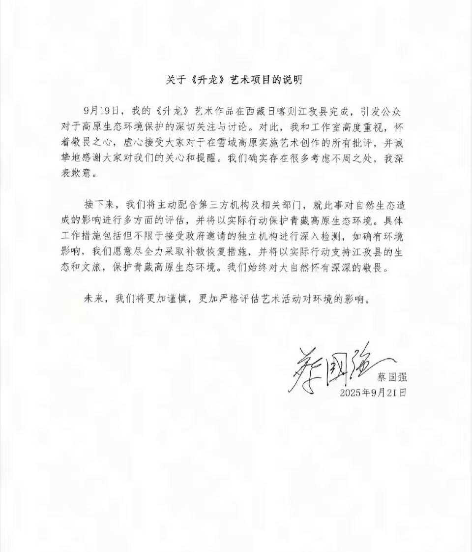 我好奇查了一下,蔡国强和始祖鸟道歉这事。 真是不查不知道,一查吓一跳。 万万没想到,两封道歉信读起来像一个人写的。 始祖鸟说感谢大家对高原生态的关切监督,诚恳接受批评建议; 蔡国强说虚心接受对雪域高原创作的批评,感谢关心提醒,都承认考虑不周,语气都挺实在,没绕弯子。 这两封道歉信这么像,难道真是商量着一起写的?