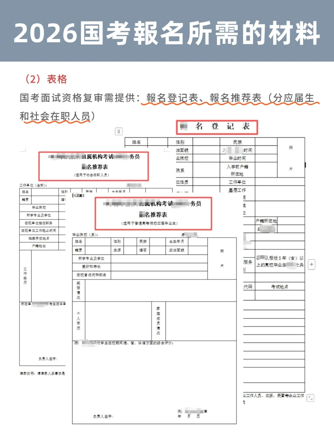 国考面试资格复审需提供:報名登记表、報名推.荐表(分应届生和社会在职人员)