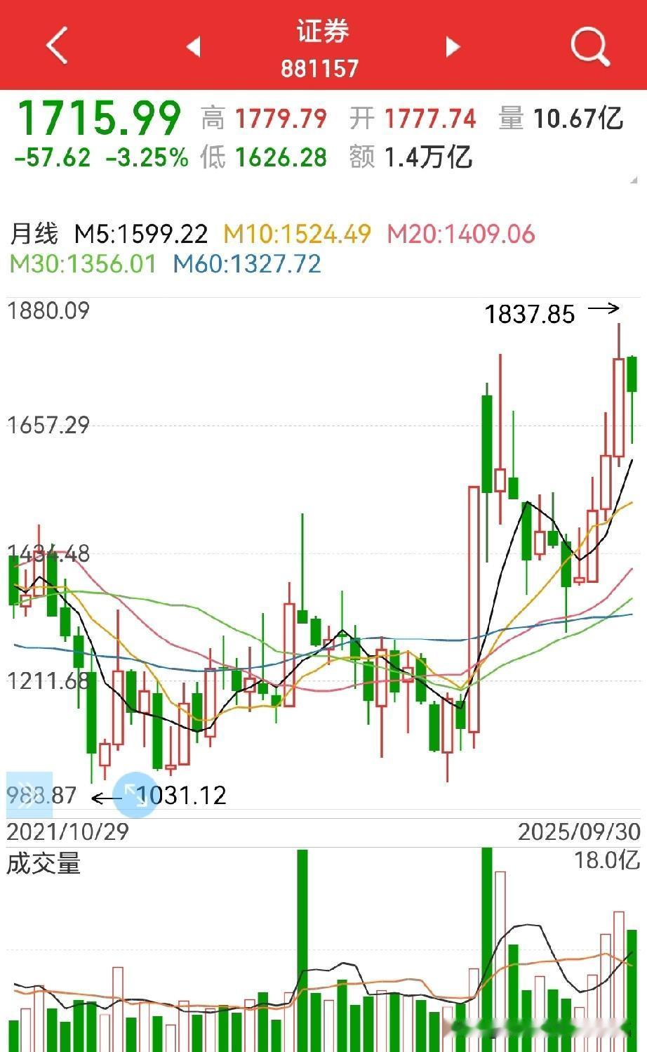 券商板块,节后该怎么看? 9.29日的中阳,让人又对券商板块产生了憧憬,但9.30日的阴十字星,又浇灭了不少人的激情… 券商板块,确实让人又爱又恨! 从节日期间的各方消息面及美股、港股的走势看,包括节前最后两个交易日的走势,以及节后新股民入场…等,节后的走势应该是非常乐观的。 板块上科技中电池有突破方面的利好消息,AI有美股AI眼镜的热炒引领,有色、贵金属有纽约金价突破4000美元/盎司…等,另外地.缘方面的消息对军工板块也有一定的刺激。 所以,节后大盘方面可以积极看多。 但是,3900点、4000点,甚至更高或者说要在一段时间内站稳4000点,没有券商板块的力挺估计也不行。 那么,券商板块,个人认为,还是会有一小波,比如创出8月以来的新高,又比如如下图2,周线上走成小双头,月线上(下图3),走成大双头,从而短线上为大盘上攻4000点打一个配合。